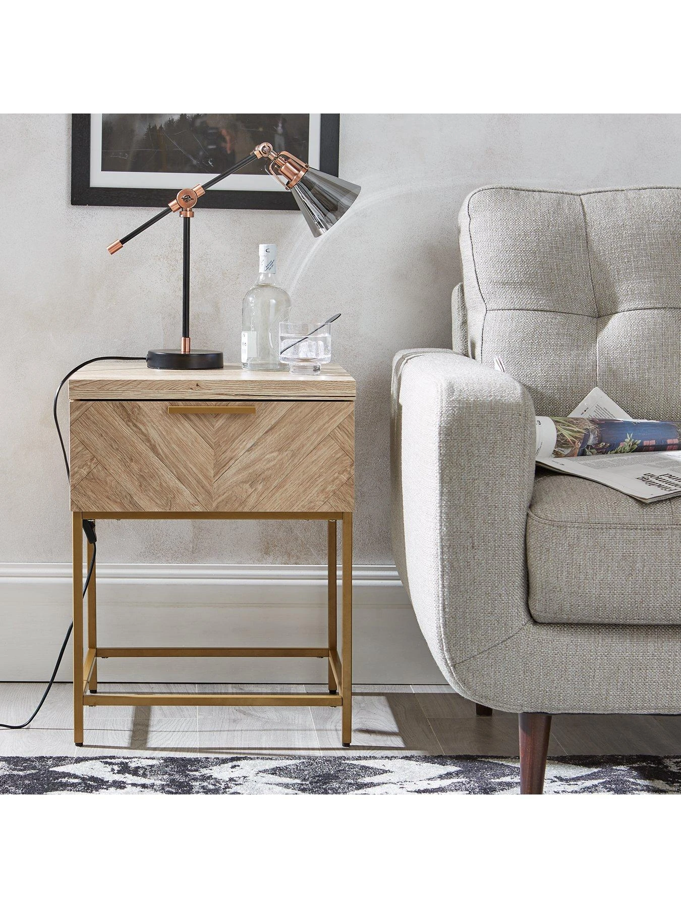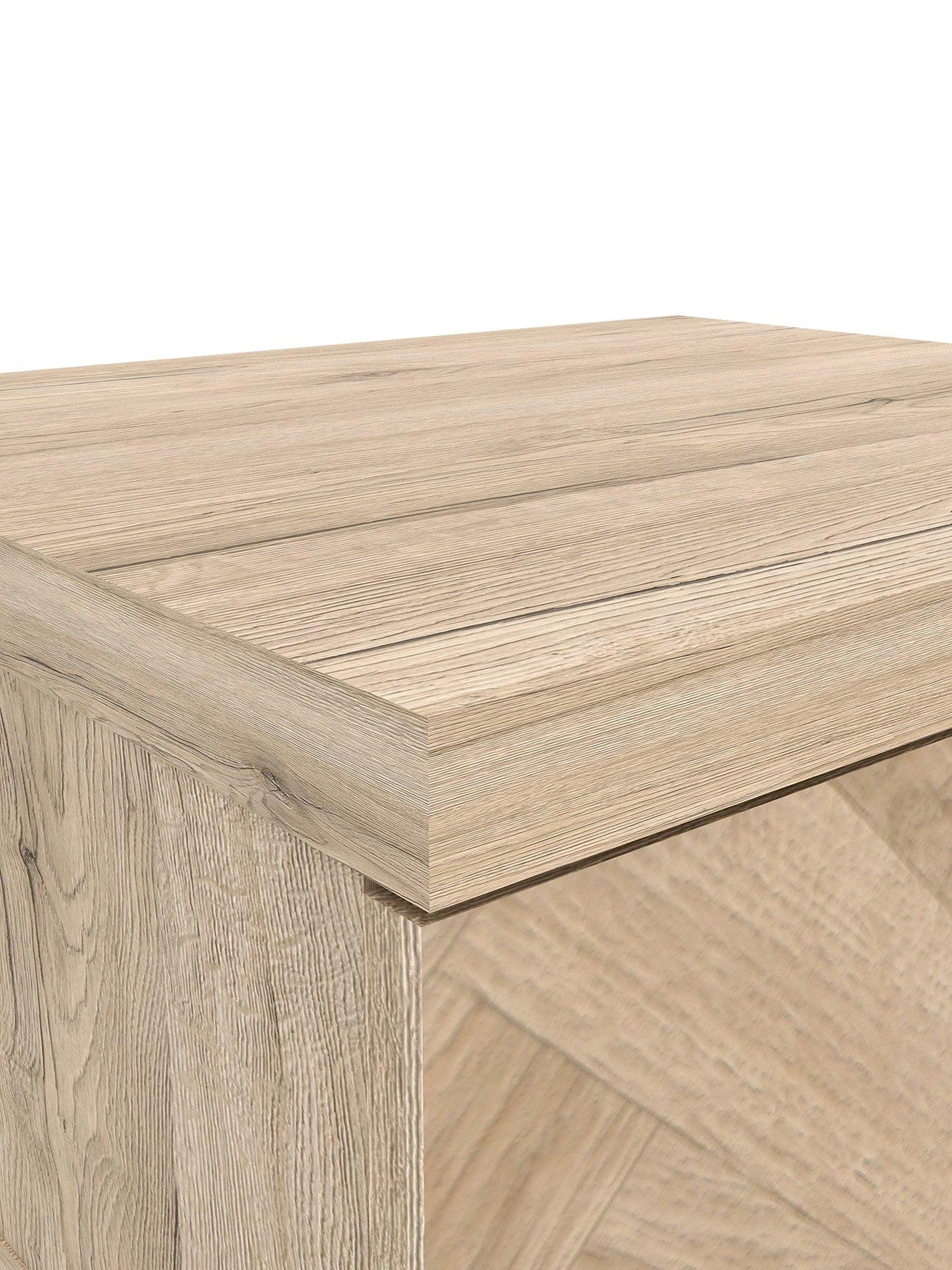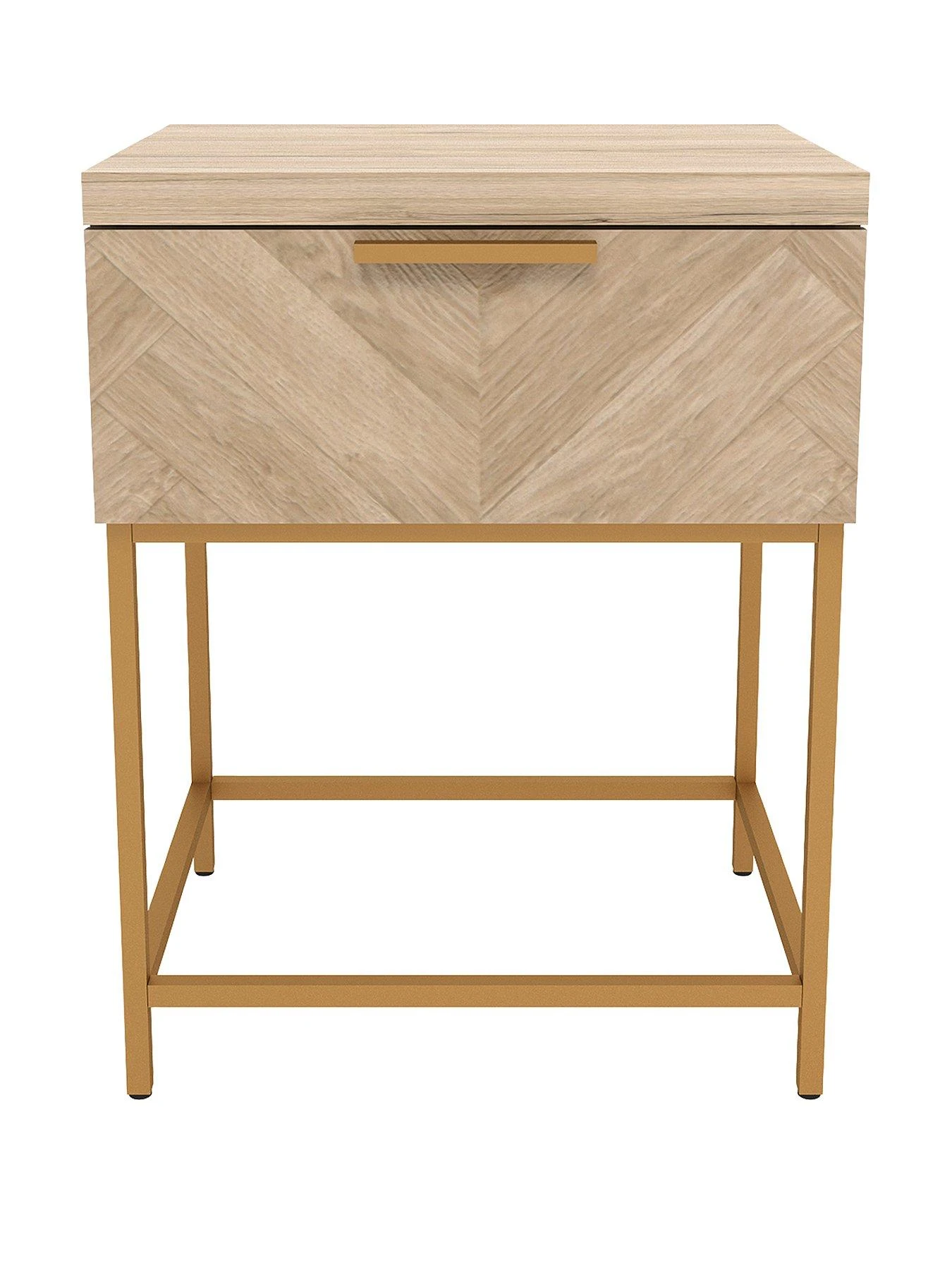 Finished in a warm oak-effect with a deep, realistic grain, its drawer flaunts a striking parquet design. The furniture sits on metal legs for a contemporary industrial influence that’s softened by a rich rose gold tone, and the look is echoed by the metal handles.
