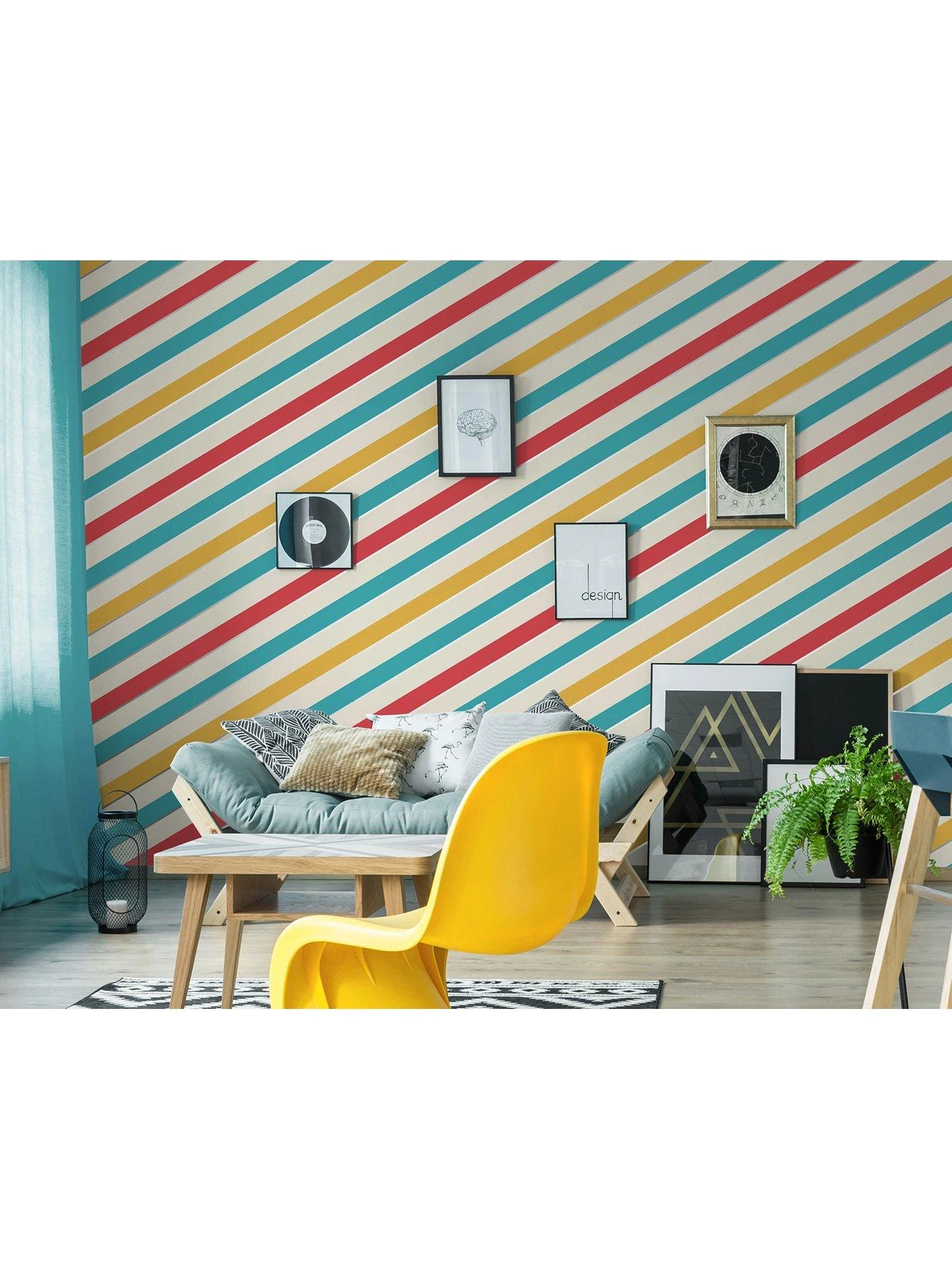 Bright, bold and big diagonal stripes will pop from your wall. Using strong, vibrant colours on a light backgropund with simple metallic detail, this simple stripe is effective and eye-catching