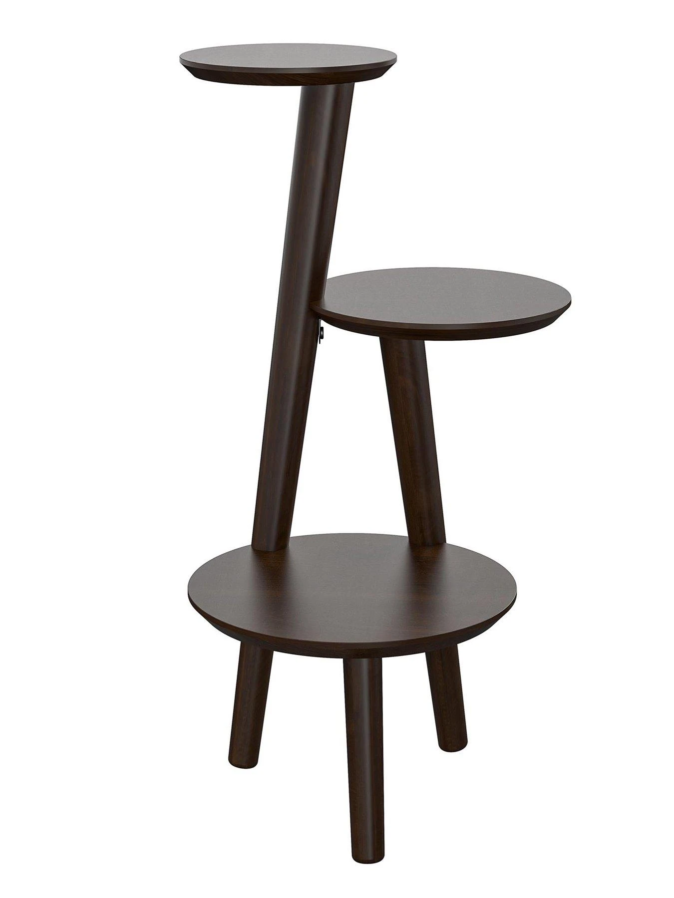 Finished in a beautiful walnut-effect on a real wood veneer that gives the look and feel of real wood and pairs perfectly with the angled real wood legs. Styled to resemble classic 50s furniture, the mid-century modern design features three circular shelves of different sizes that sit at different heights to give your favourite flowers or pot plants a striking multi-level look.