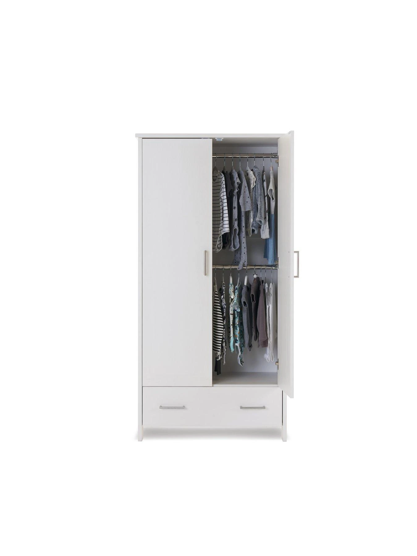 The Nika double wardrobe features one large cupboard space, with 2 sturdy hanging rails for all of your little one’s special outfits, fronted by a pair of soft close doors. Underneath the main cupboard area is a large, full depth drawer providing the perfect storage solution for those items that cannot be hung up. Also features stylish brushed metal handles.