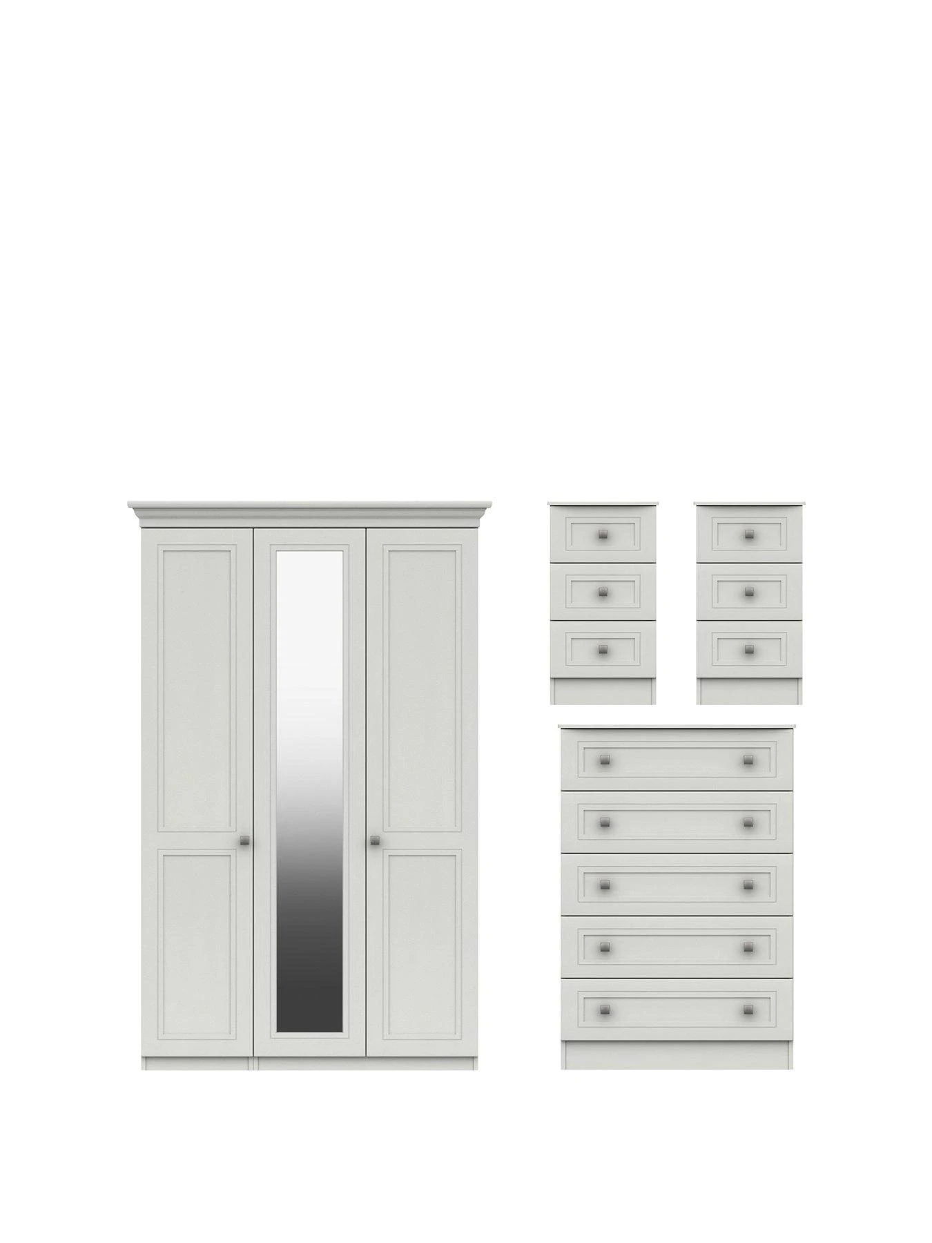 This great value 4 Piece Part Assembled Bedroom Furniture Set from the Harris Collection contains a 3 Door Mirrored Wardrobe, Chest of 5 Drawers and a Pair of 3 Drawer Bedside Chests