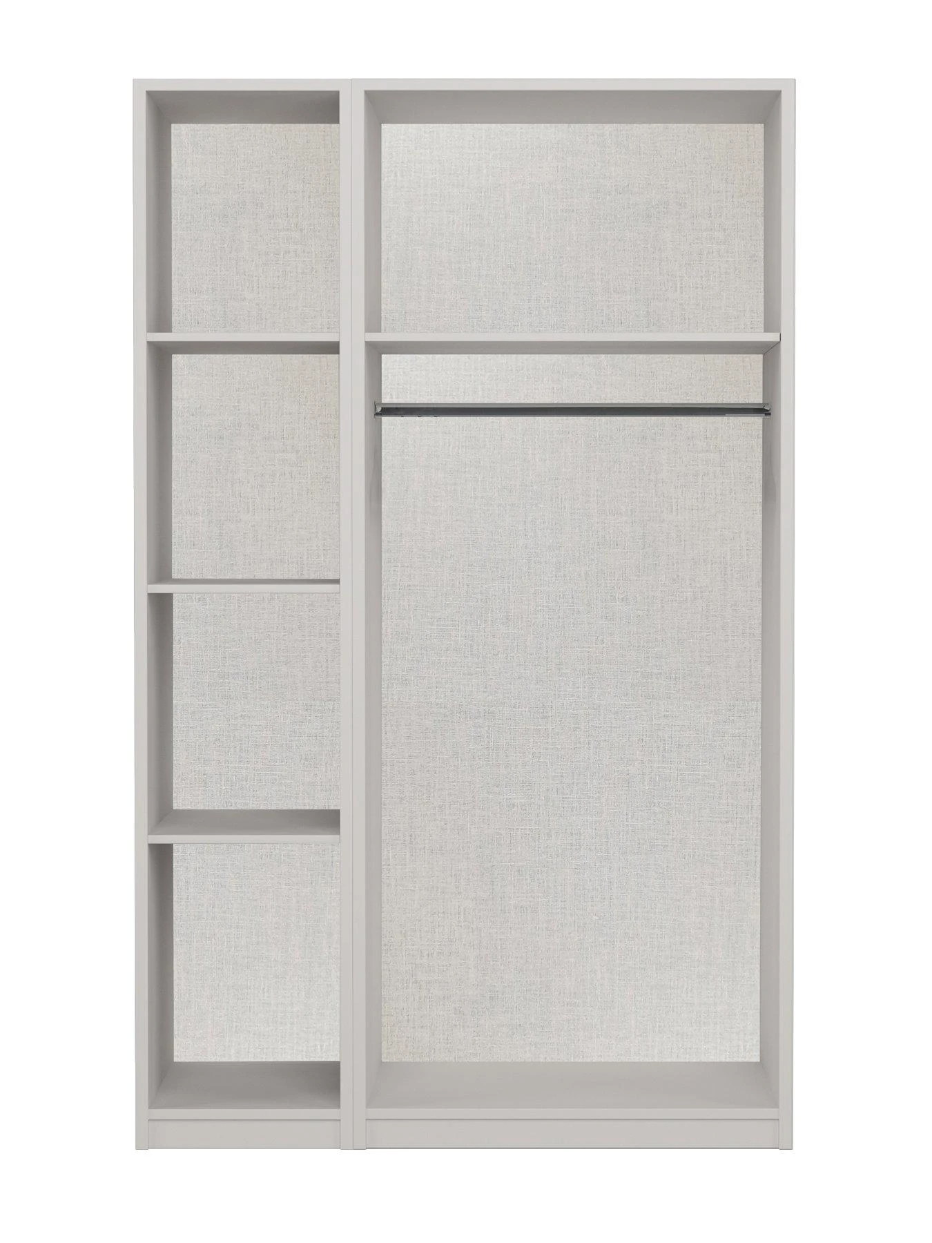 Inside flaunts a linen-look back and two sections – a hanging rail and high shelf behind the double doors and a series of smaller shelves behind the single door.