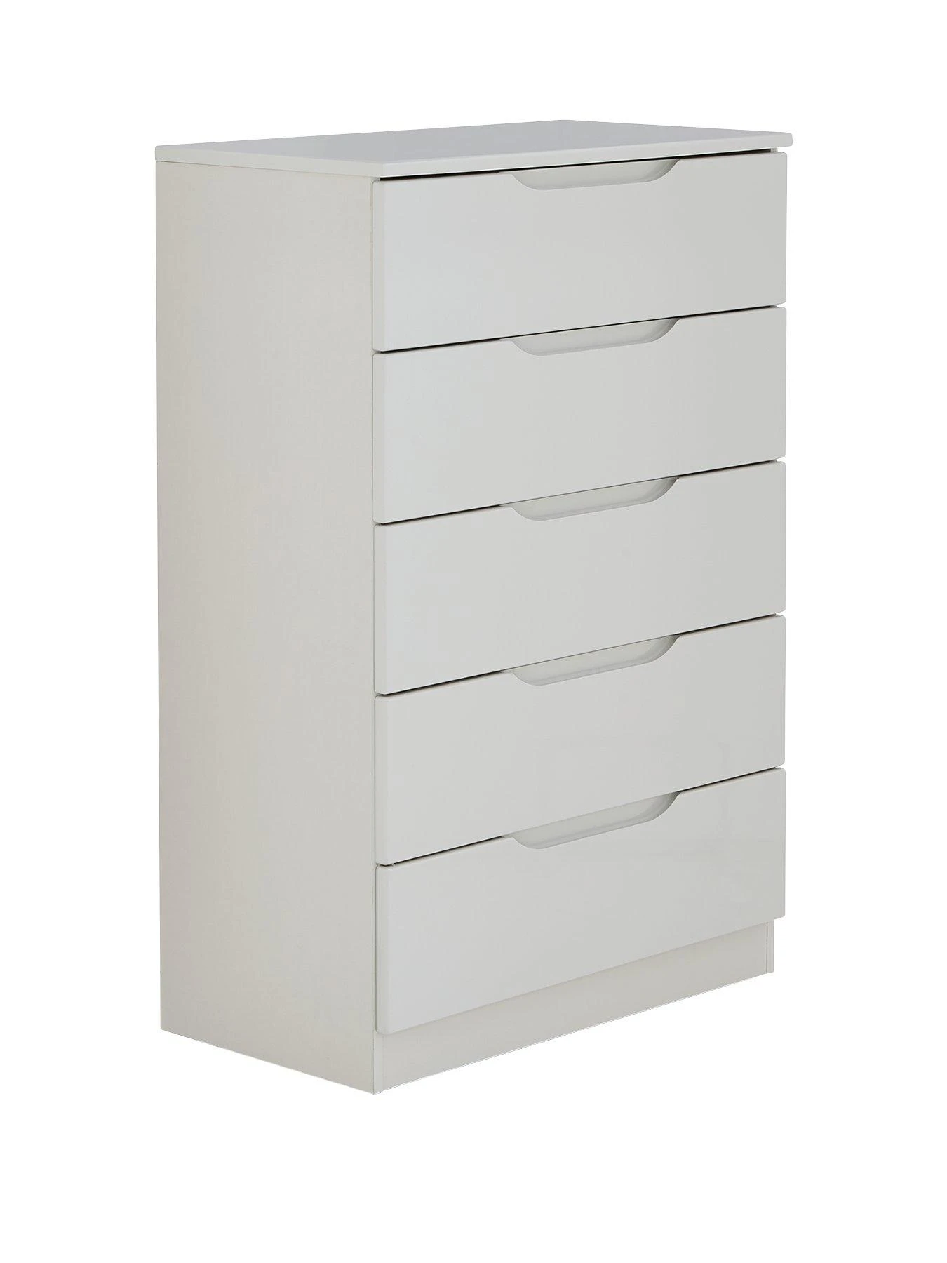 This great value Ready Assembled 3 Piece Monaco Gloss Bedroom Furniture Package contains a Chest of 5 Drawers and a Pair of 3 Drawer Bedside Chests