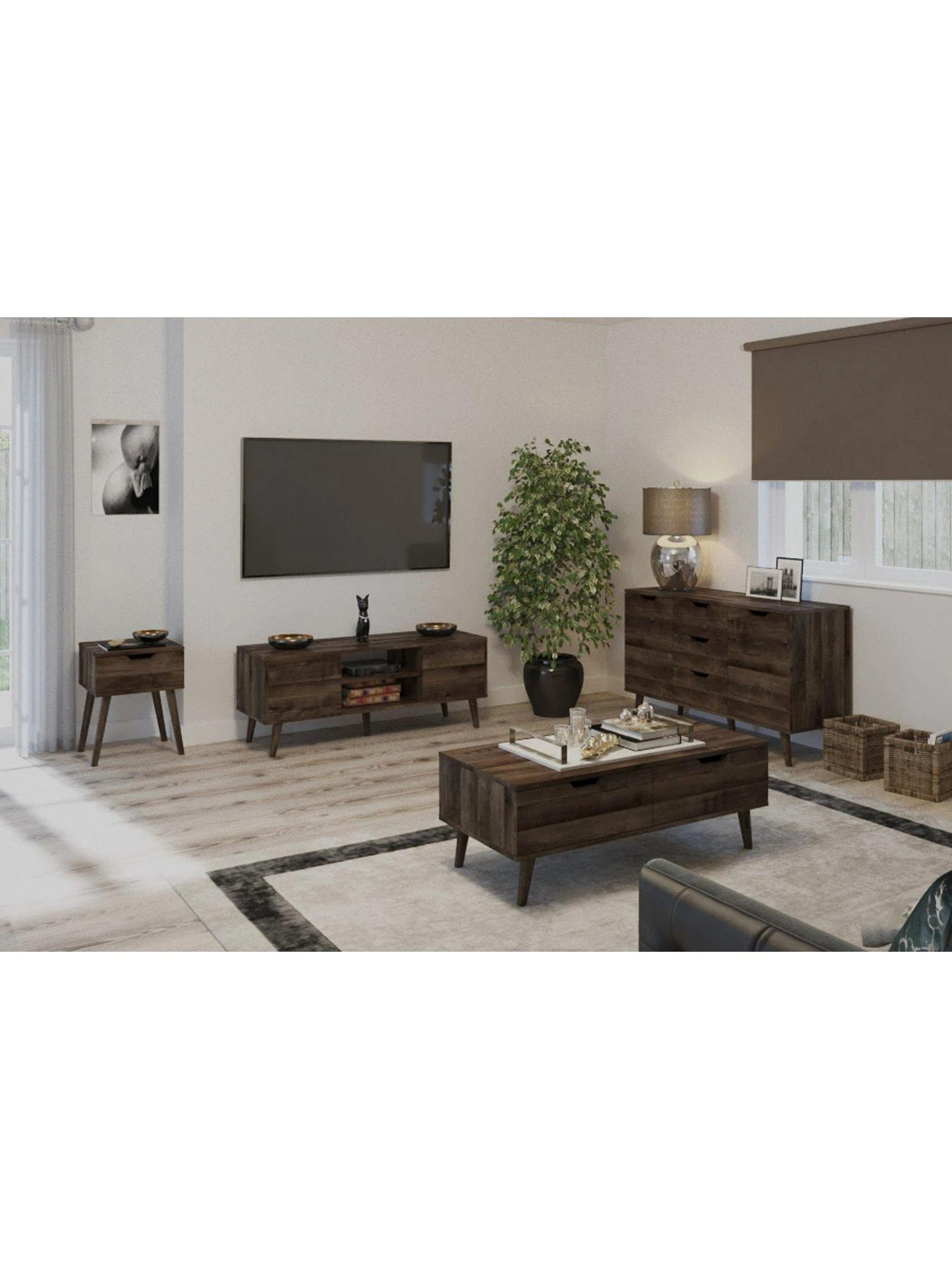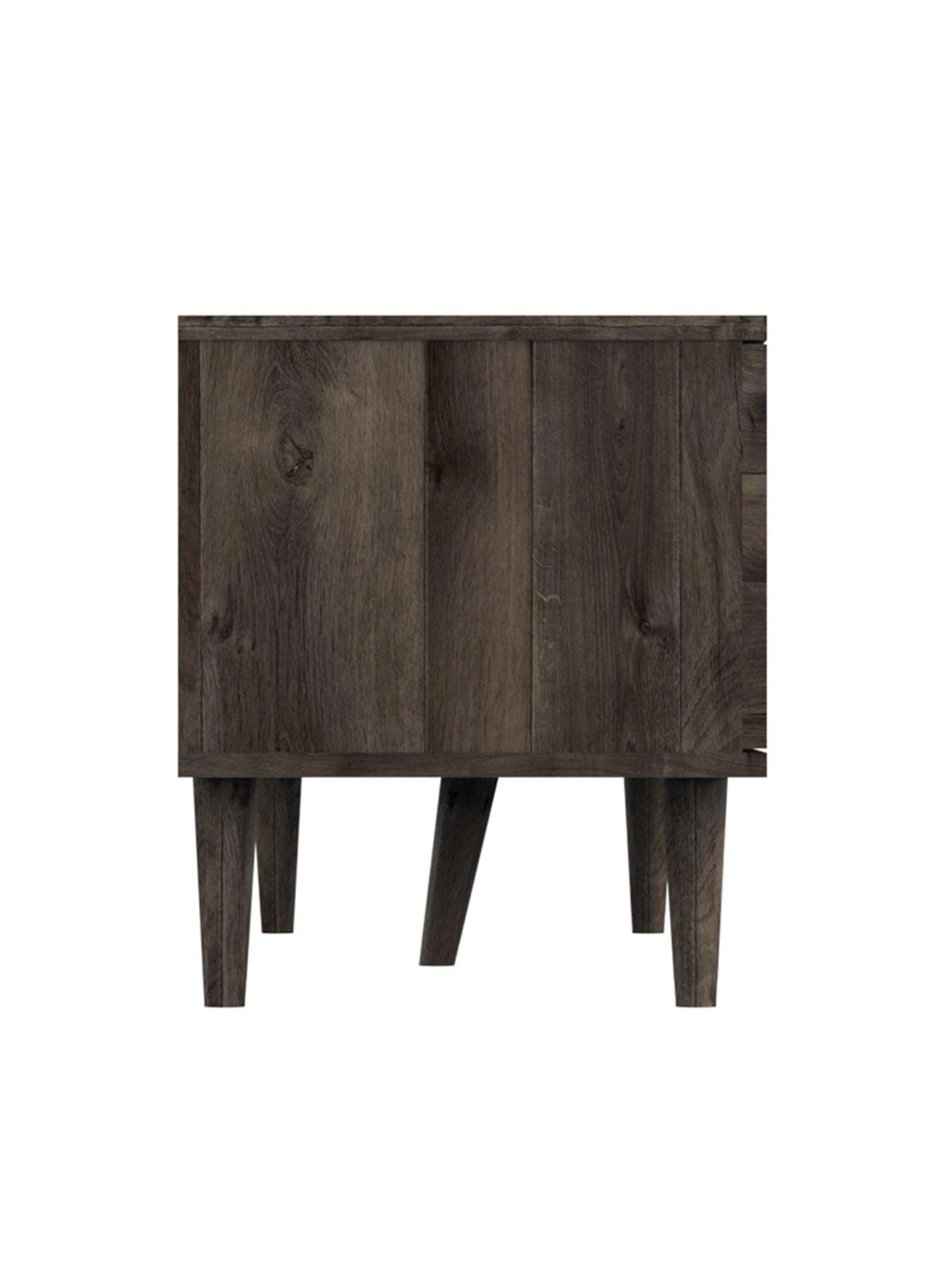 The first thing you’ll notice is the breathtakingly grained oak-effect finish which catches the eye with its stunning pattern of knots and grain variations. Then there are the mid-century modern splayed feet which not only give it a Scandinavian vibe but also raise it slightly off the floor, making it easy to clean under.