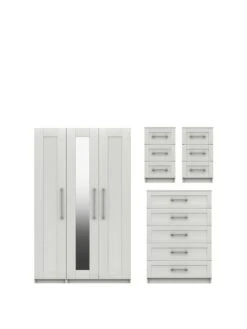 This package deal from the Regal range flaunts a classic shaker style that’s highlighted by the framed doors and drawer fronts. A white gloss finish catches the light to put some shine into your sleep space, while added an extra glint comes from contemporary polished chrome D-shaped handles and the inset mirror to the centre door on the wardrobe.