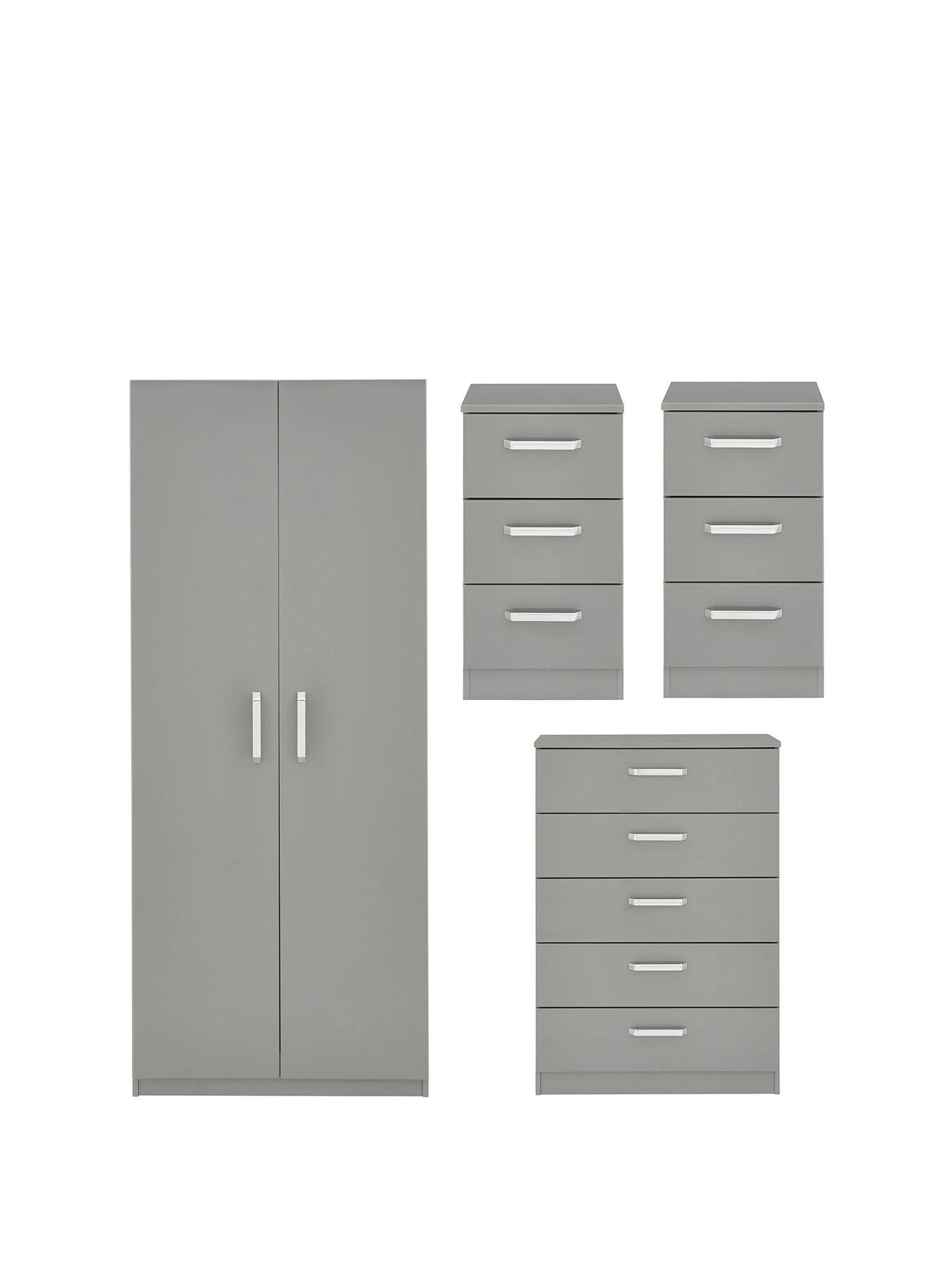 Sanford High Gloss Ready Assembled 4 Piece Package – 2 Door Wardrobe, Chest of 5 Drawers and 2 Bedside Chests