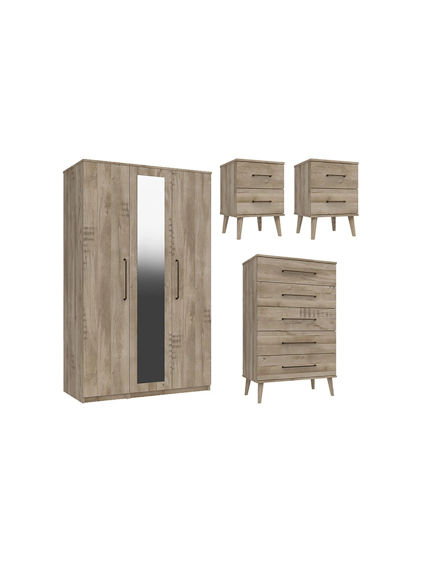 You’ll get a 3 door wardrobe with a mirrored centre door and lots of hanging and shelving space inside. There’s also a 5 drawer chest and a pair of 2 drawer bedside chests, all of which sit on trendy Scandi-style splayed legs and benefit from linen-look linings and smooth, friction-free easy-glide metal runners.