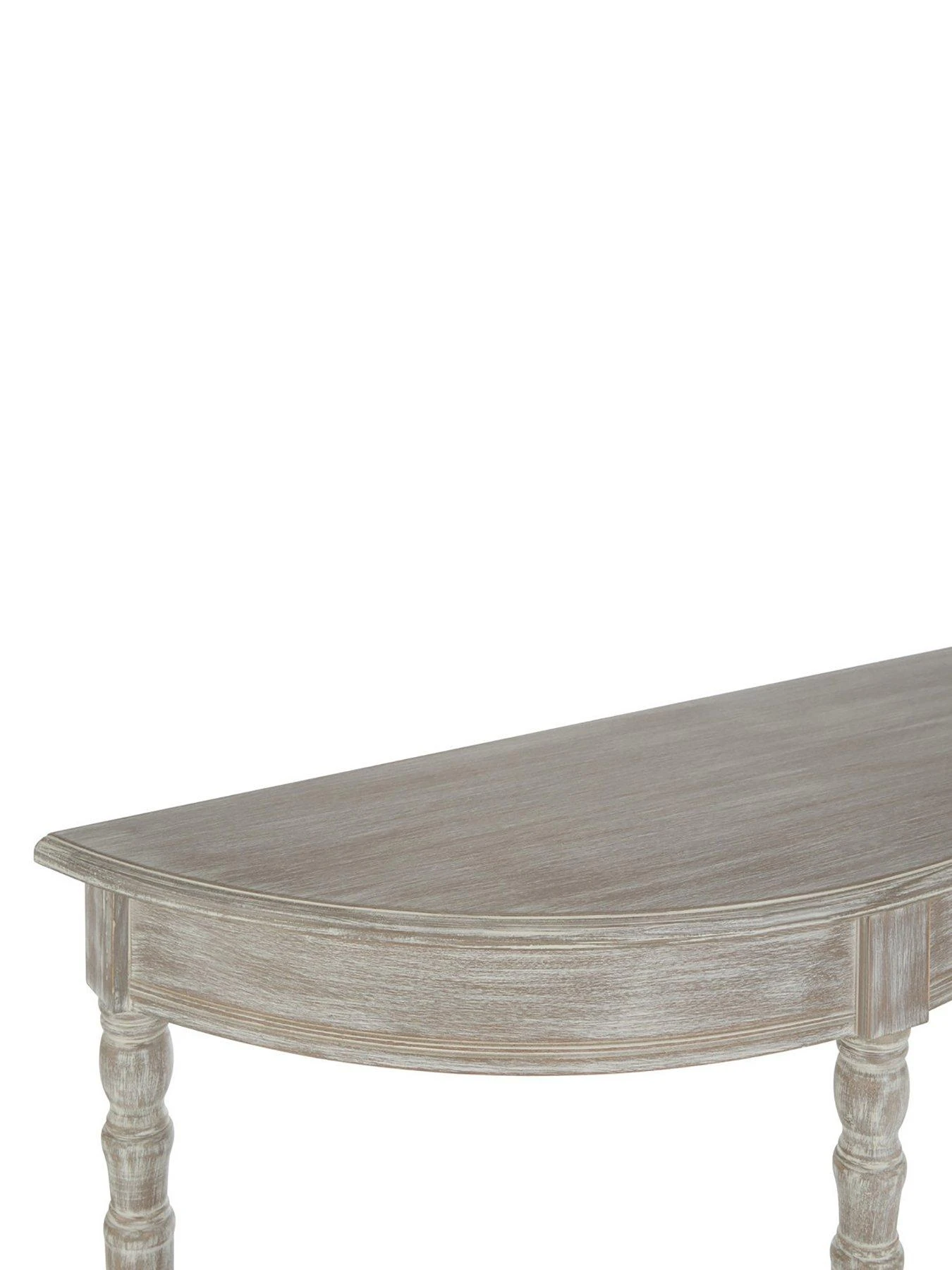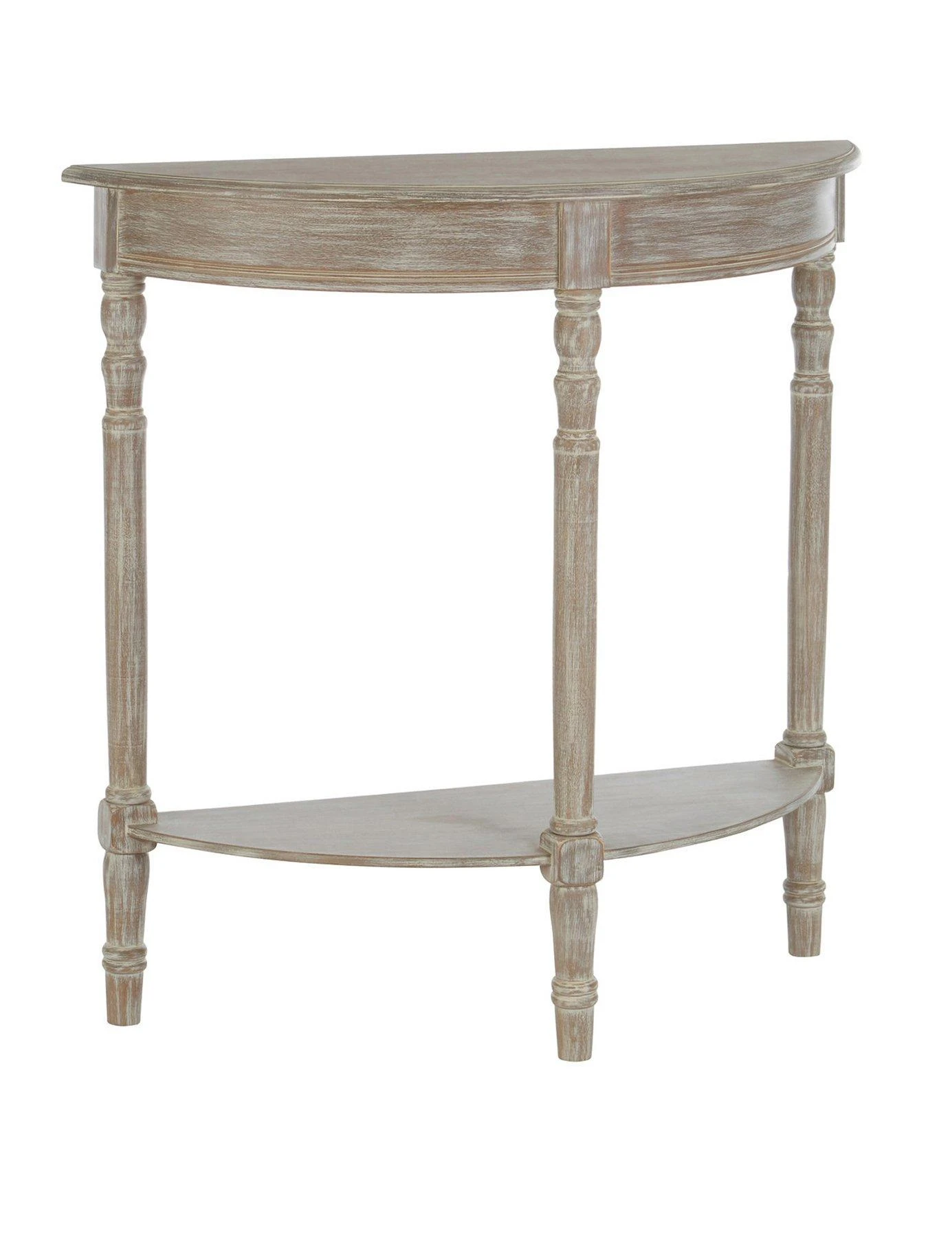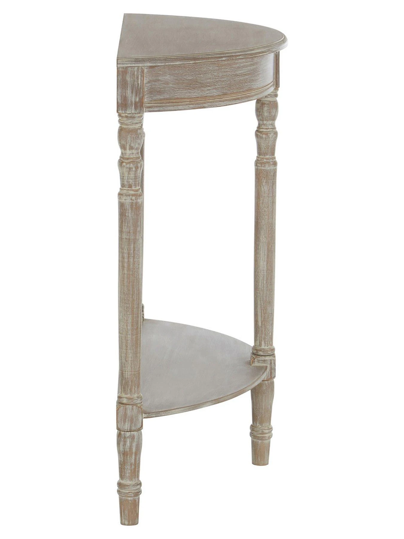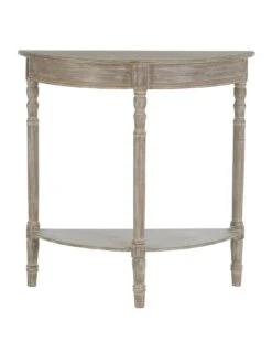 The Heritage Winter Melody console table fits snugly against the wall, its half-moon shape complementing the rounded knop detail on its three slim legs. Made from natural pine wood, its washed oak finish accentuates the carved features. Its upper display