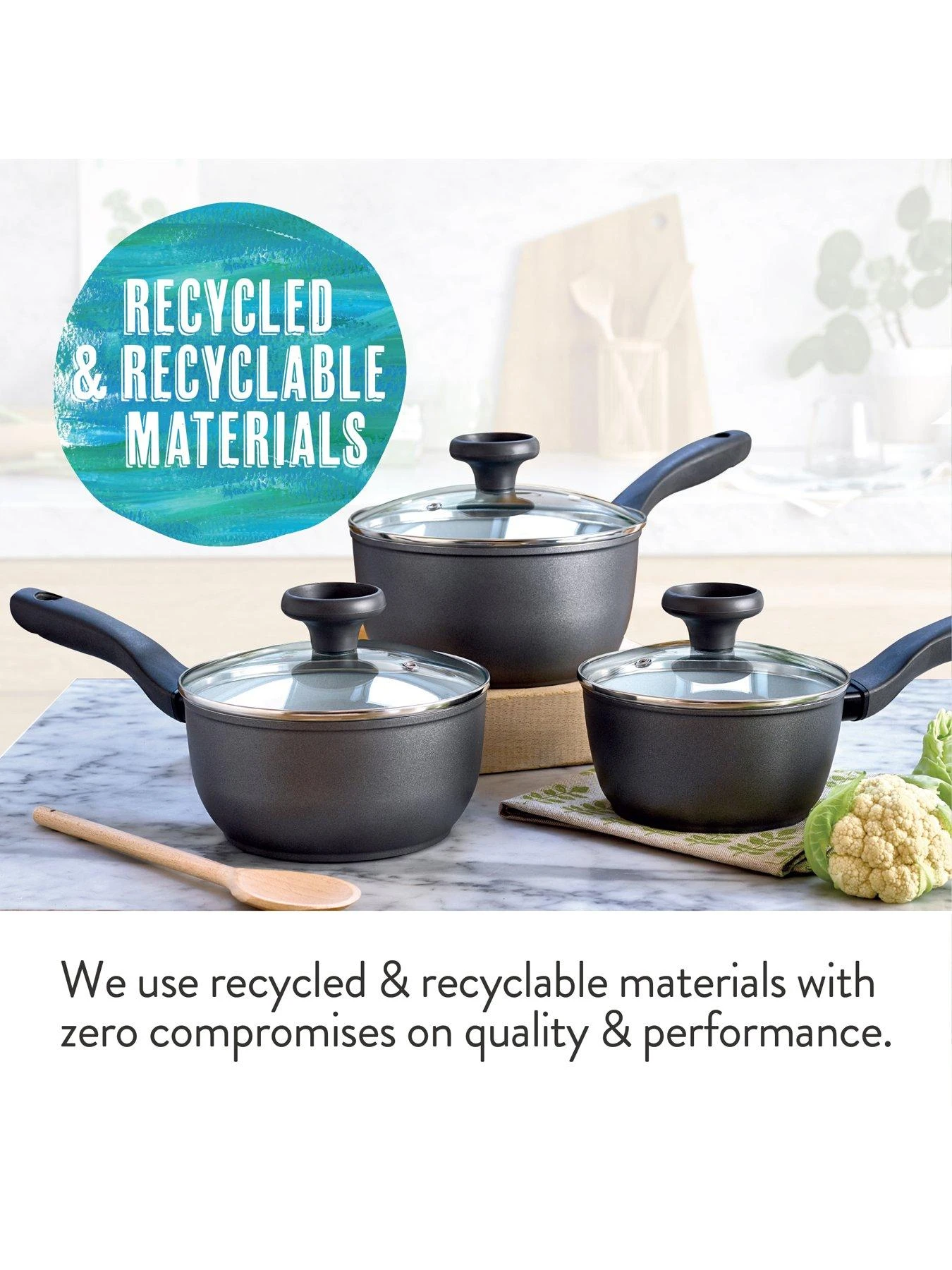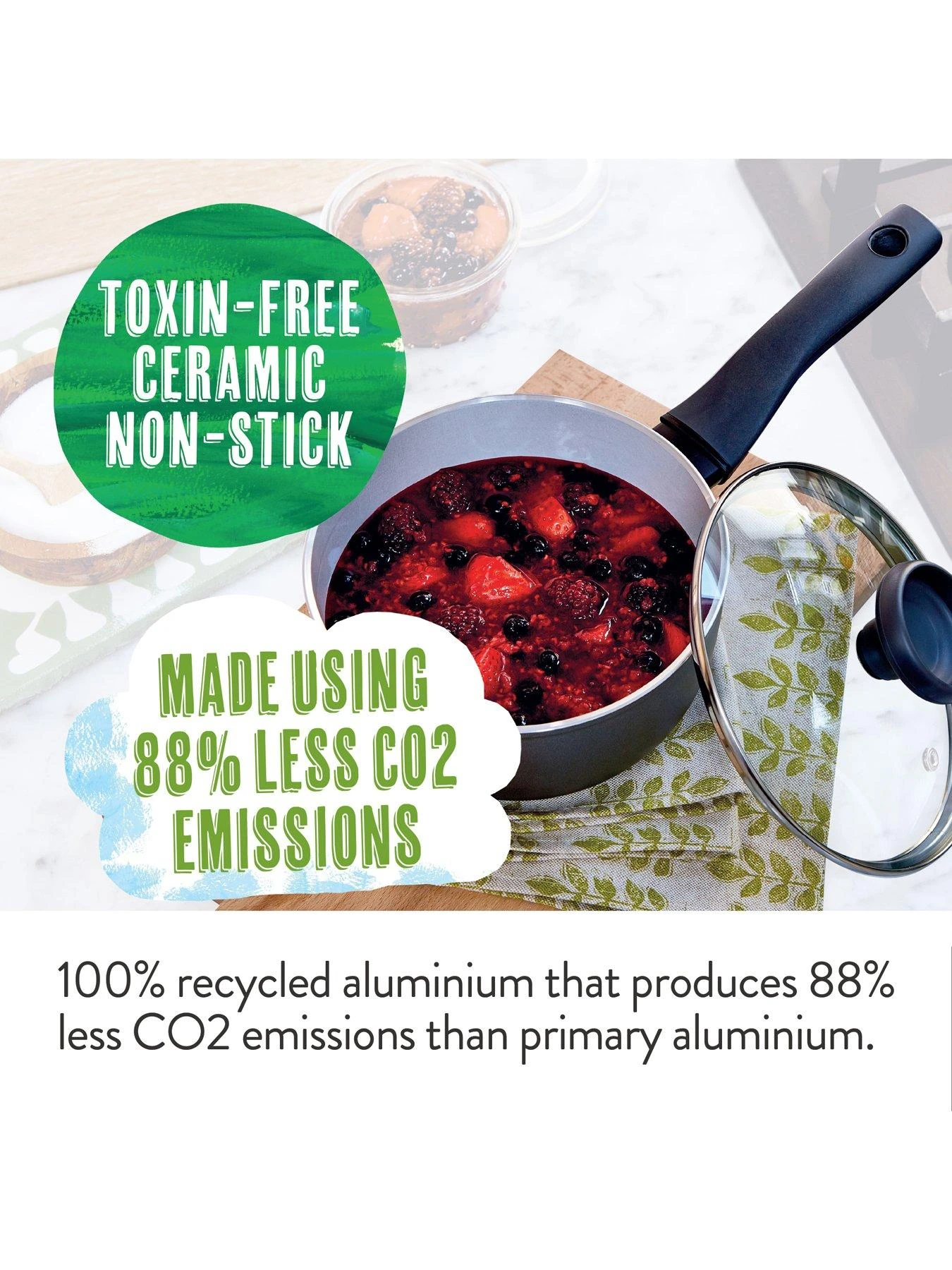 - Material Content: Recycled Aluminium alloy body, recycled bakelite handle, stainless steel disc in base, ceramic non-stick