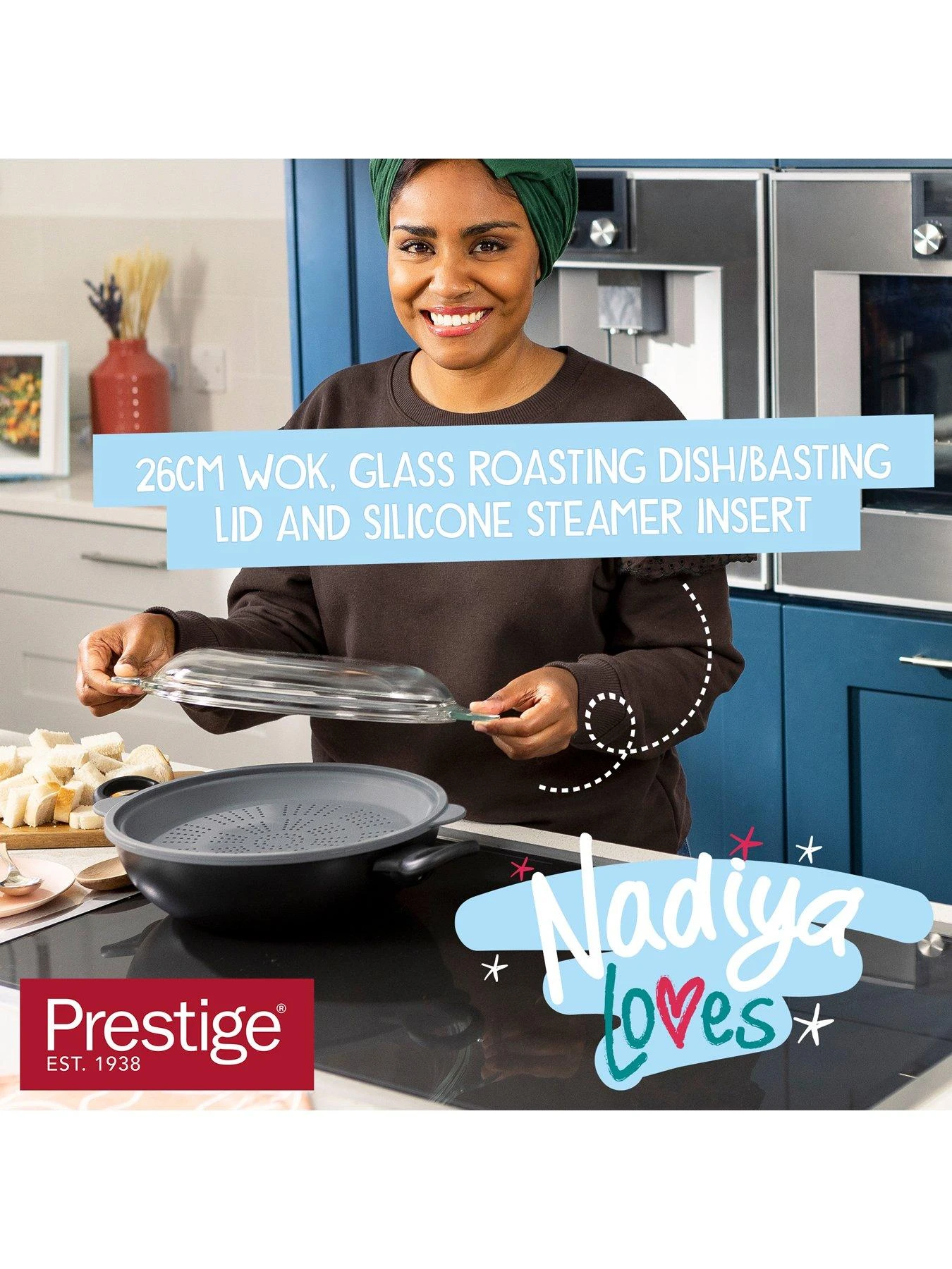 Prestige x Nadiya – 4 in 1 Wok – Perfect for larger dishes, get togethers and family meals! Nadiya Hussain and Prestige – We have partnered up with Chef and Author Nadiya Hussain to create a range of Cookware and Bakeware based on shared beliefs and values to create the perfect products for your family kitchen. Combining beauty with real benefits this range ensures that you will always have the right tool for the job. Durable cookware – The material used for this induction hob wok set is extremely durable and easy to clean. Superior scratch resistant non-stick – The superior non-stick added to this aluminium wok set and accessories is scratch resistant and ultra durable. It also has a non stick exterior making it extremely easy to clean. With the scratch resistant non stick interior, you can prepare healthier meals with no or little oil, using any utensils in your kitchen. Suitable for all hobs – including induction – Whatever the type of hob your use, this non stick stir fry pan set will fit perfectly in your kitchen! Gas, electric, induction, our Prestige x Nadiya range is compatible with all hobs. The high quality super thick steel base will ensure fast even heat distribution – eliminating hot spots and the chance of burning your food! Dishwasher safe – Prestige x Nadiya cookware is completely dishwasher safe. This means less time cleaning up your induction aluminium cookware set, and more time enjoying your meals with your loved ones. Oven safe up to 180C – Thanks to its super comfortable, stay cool oven safe handles, this Stir fry set including accessories can be used in the oven up to 180C/350F/Gas Mark 4. You will be able to unleash your creativity to enjoy a variety of cooking experience and create hob to oven masterpieces. 10 year guarantee – Fear not, Prestige x Nadia Cookware range, including this non stick frying stir fry set comes with a 10 year guarantee meaning you can cook for your loved ones with complete peace of mind.