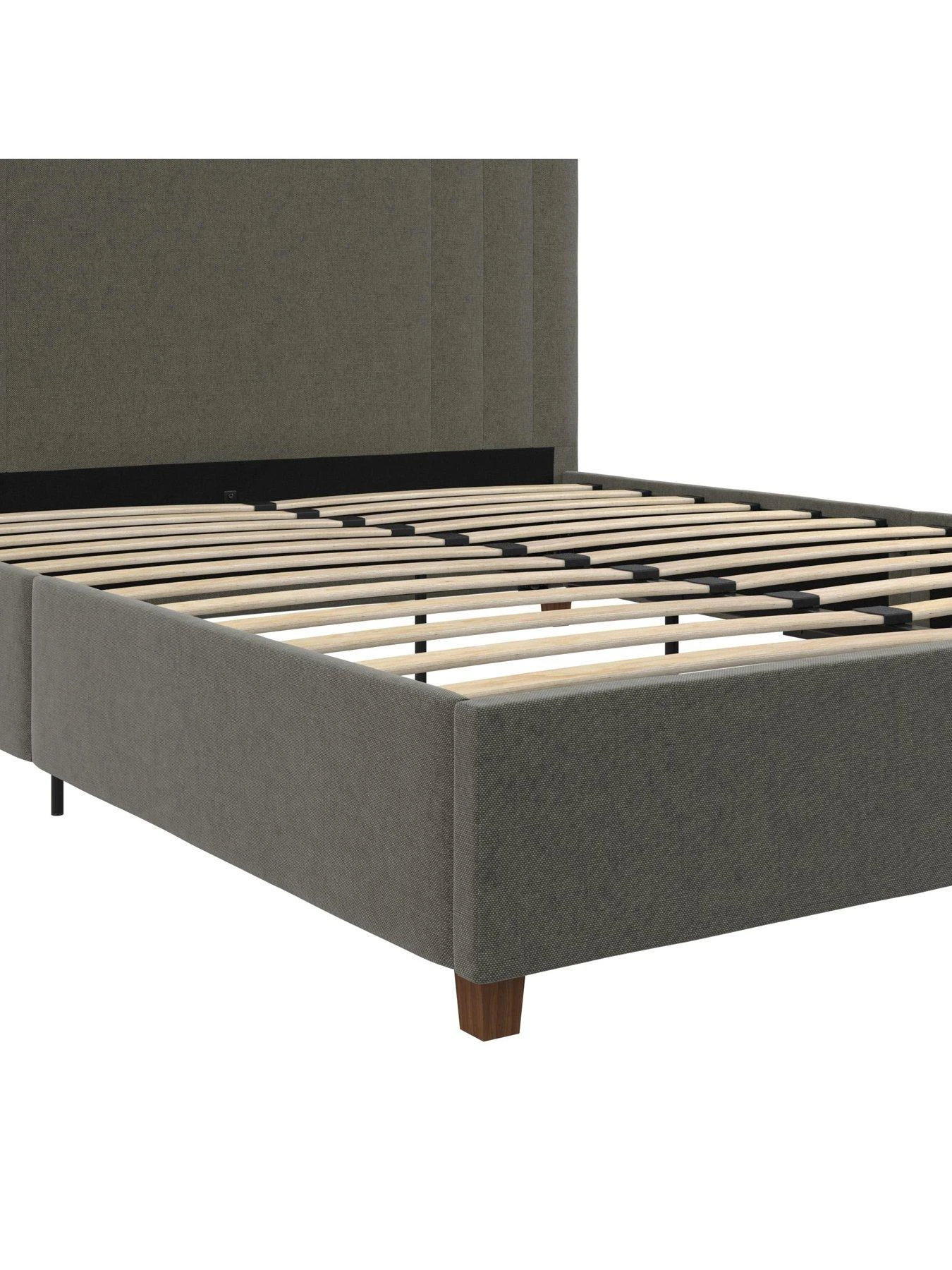 - Sturdy wood construction with soft linen upholstery and plastic legs in a wooden color finish. Mattress sold separately.
