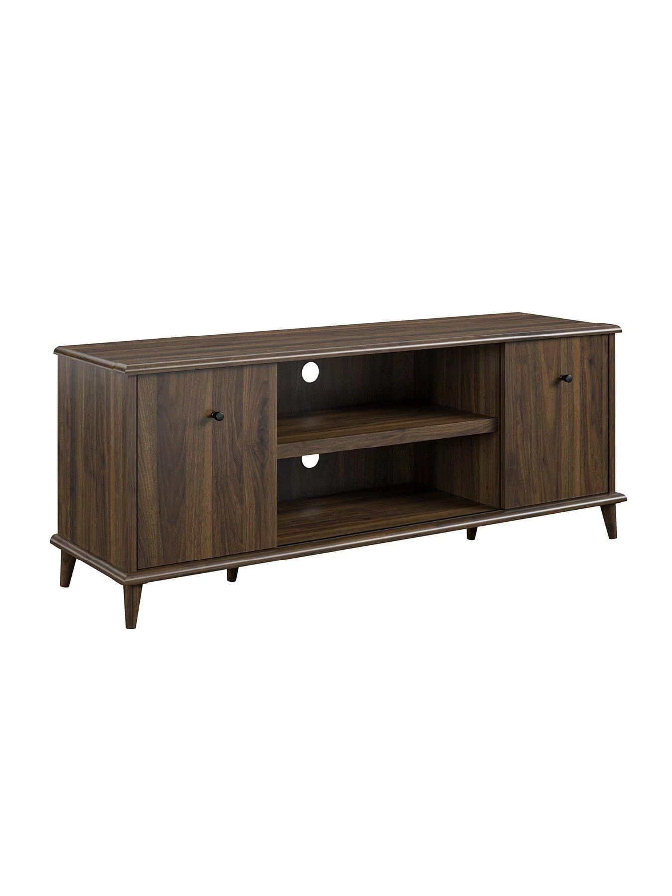 Designed with an eye-catching mid-century modern influence, the simply gorgeous furniture is decked out in a walnut-effect that flaunts a fashionable grain pattern. It’s suitable for televisions up to 55 inches in screen size and boasts two space-saving sliding doors sitting in front of a fixed shelf. You can display your peripherals in the middle of the unit to take advantage of the cable management cut-outs that keep wires neat and tidy, then use each side to conquer the clutter.