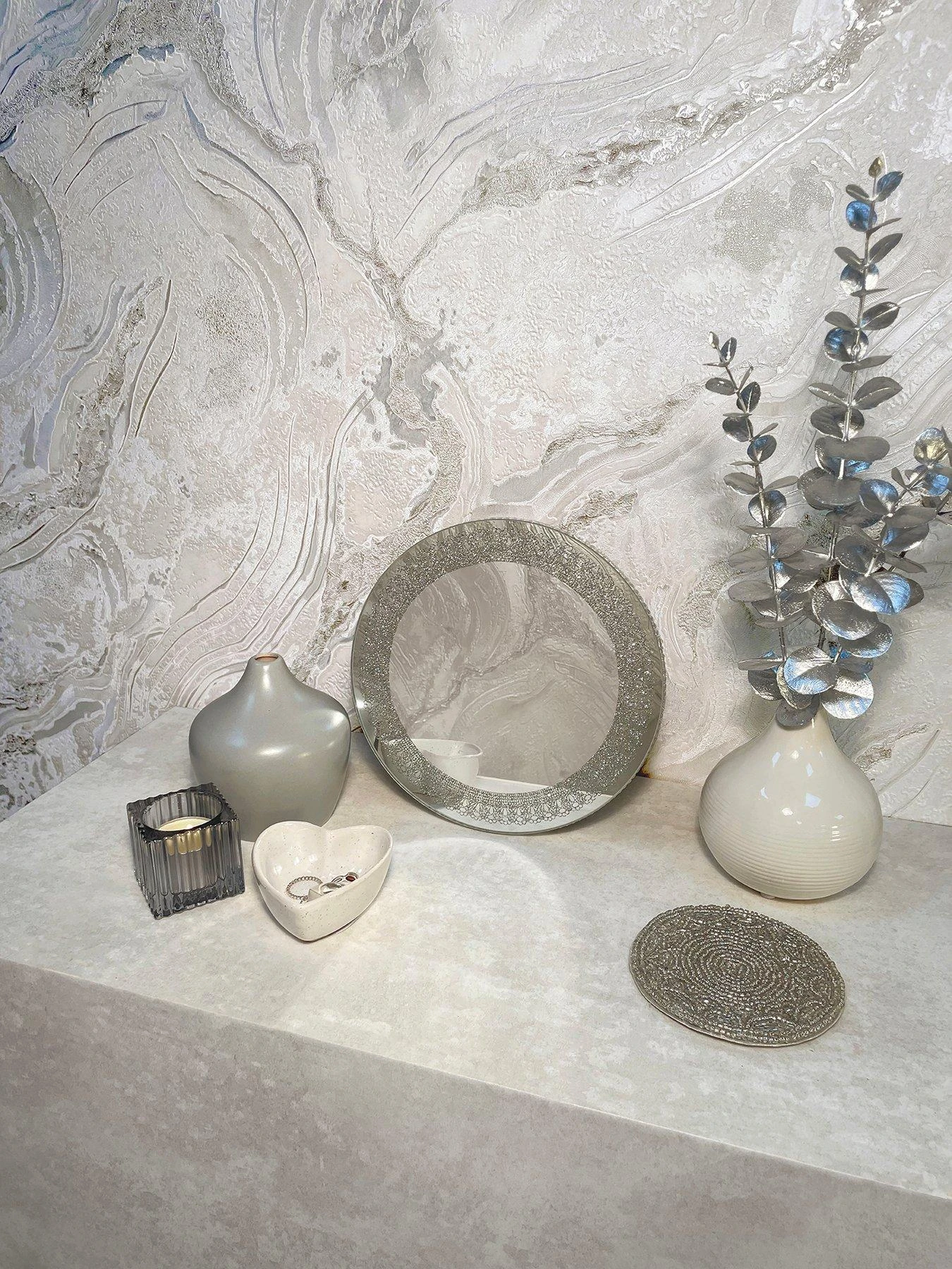 This quality heavyweight vinyl features an agate marble design in gorgeous grey, with metallic silver shimmer, subtle glitter and luxurious emboss.