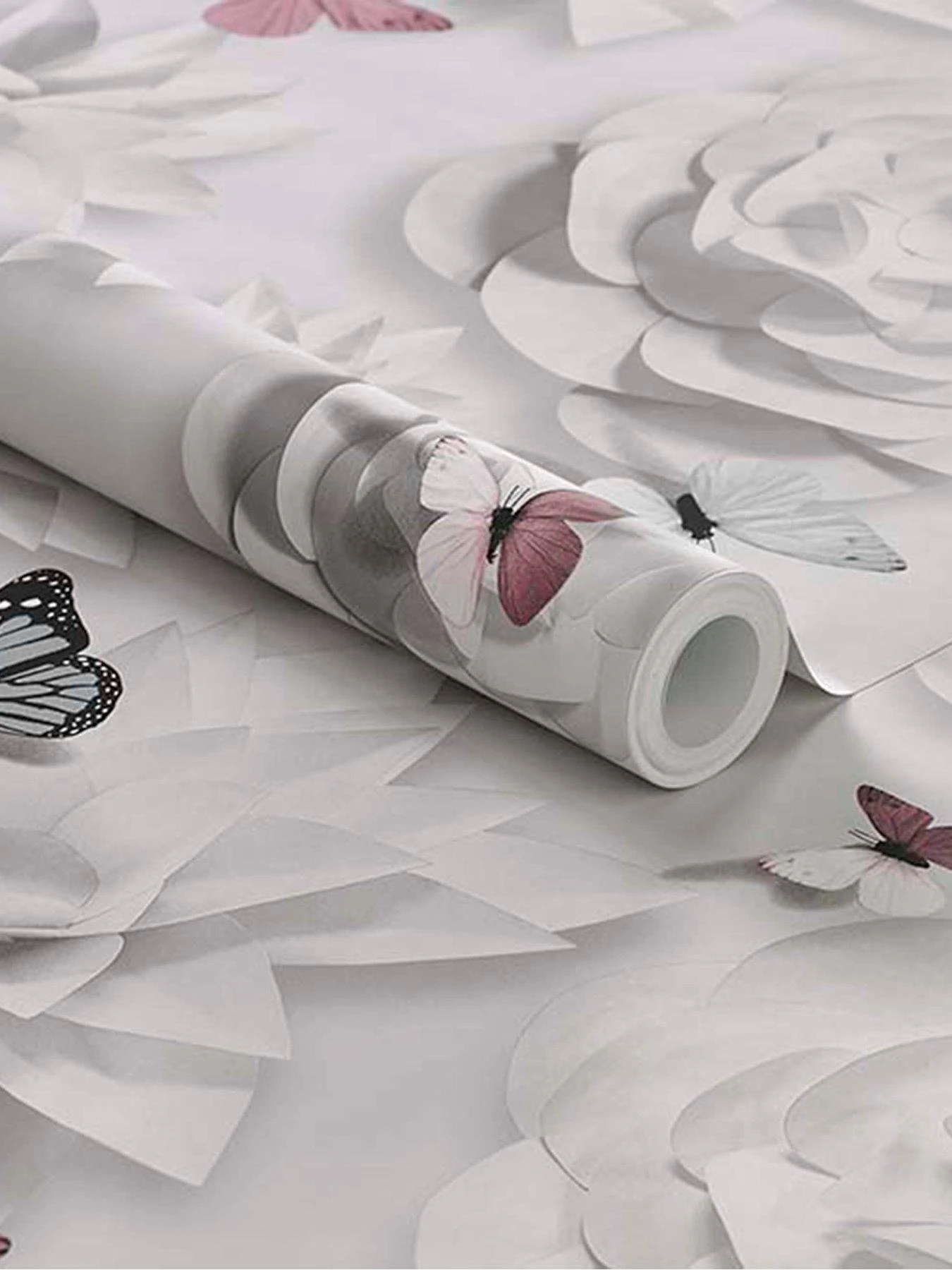 Simple in crisp white tones, the delicate design features origami flowers all over. Pretty butterfly accents add an understated pop of colour that catches the attention and makes it perfect for feature walls, yet still subtle enough to hang all around the room.
