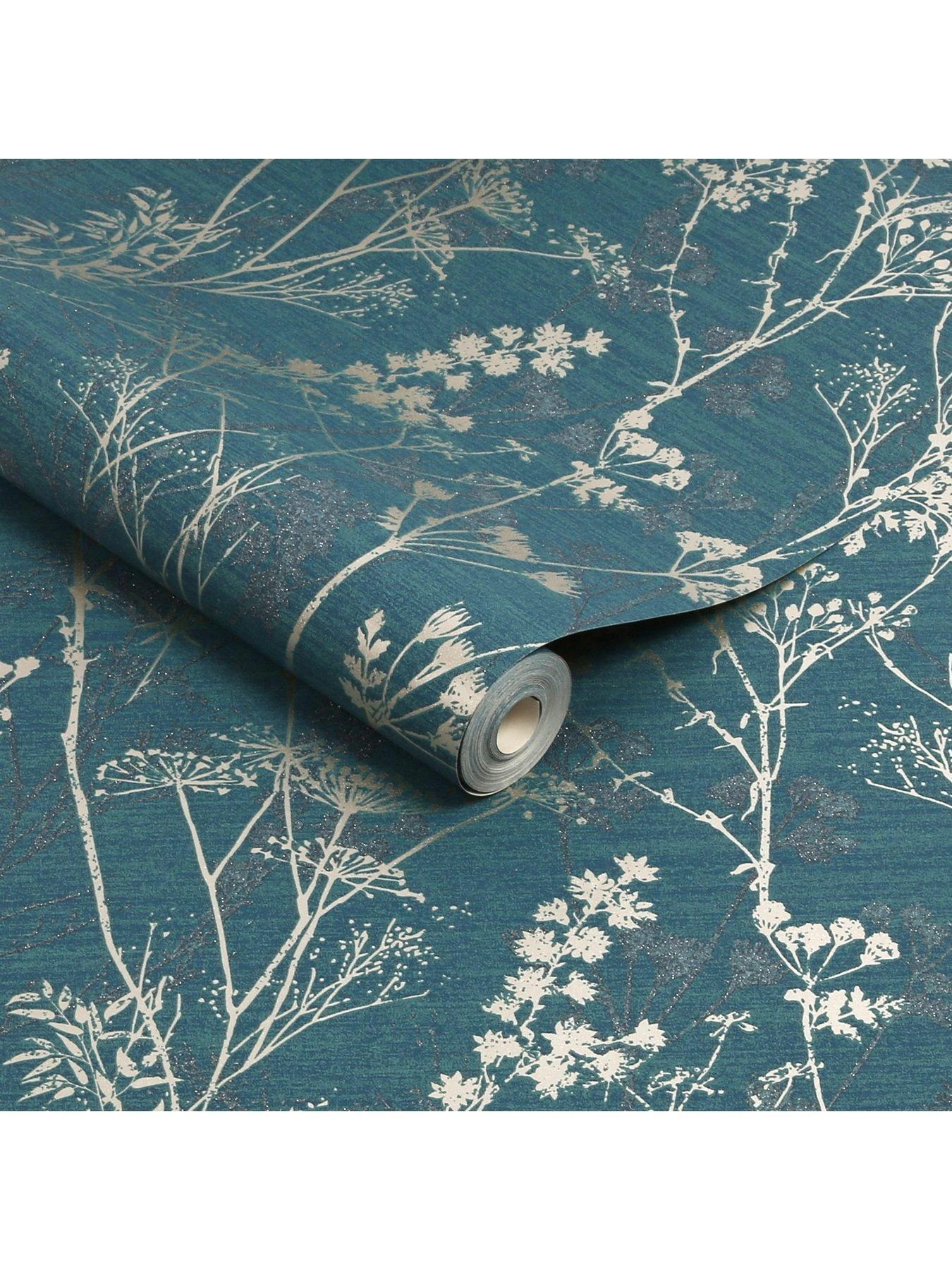 A beautifully delicate design, the Hedgerow wallpaper in teal is complemented by a sheer gold twig design mirrored by a deeper shade of teal with added shimmer of silver glitter, Adding depth of style to the décor of your hom
