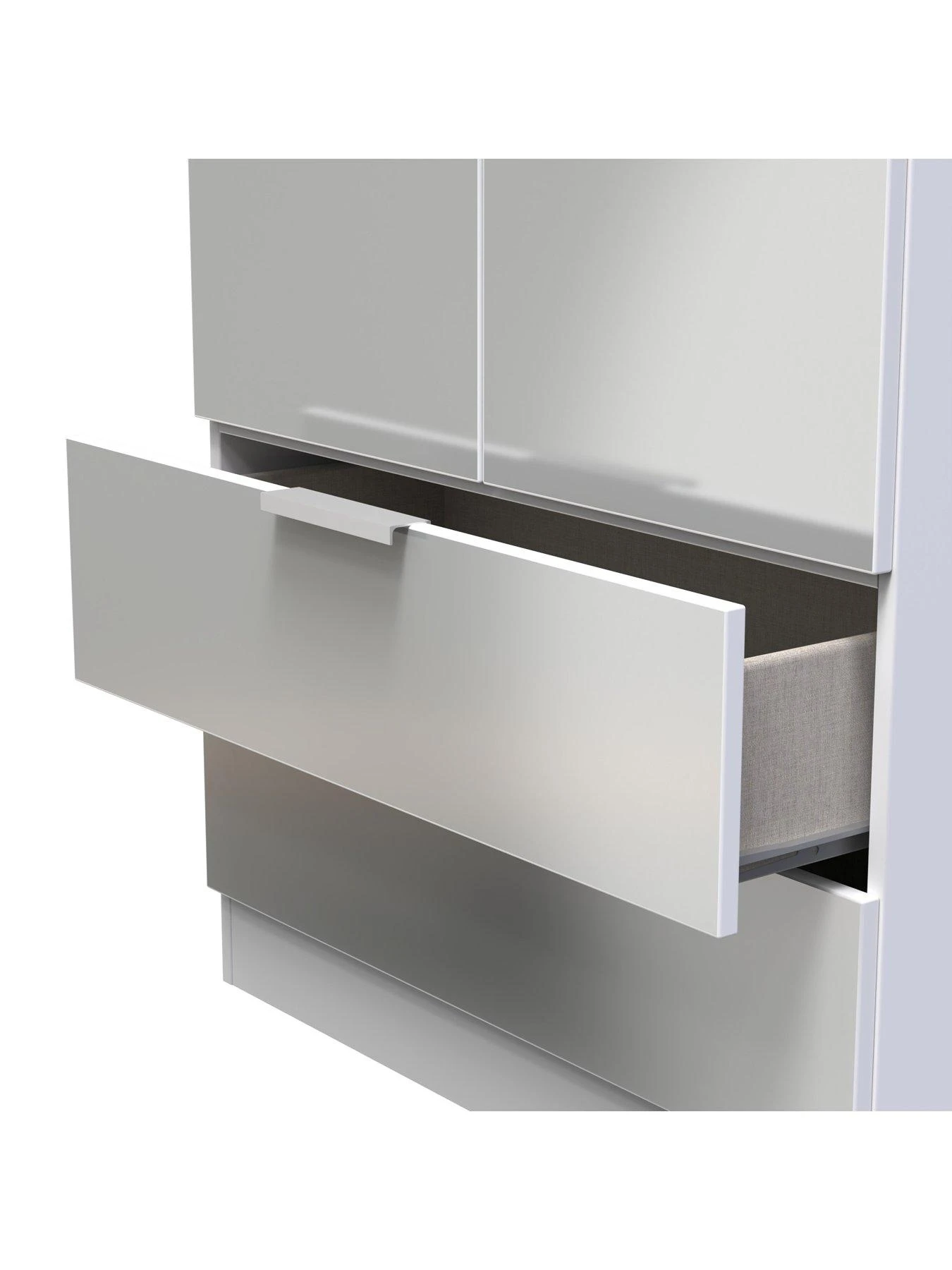 This tall double door wardrobe is perfect for any bedroom. Features the added practicality of 2 full width drawers. A Fresh modern range, with solid metal pull handles and comes in a range of scratch resistant gloss or matt finishes. All our furniture is made in the United Kingdom, to the highest quality. It is delivered direct to your location of choice by one of our two man delivery teams, and come full assembled (although legs may be removed to prevent damage in transit).