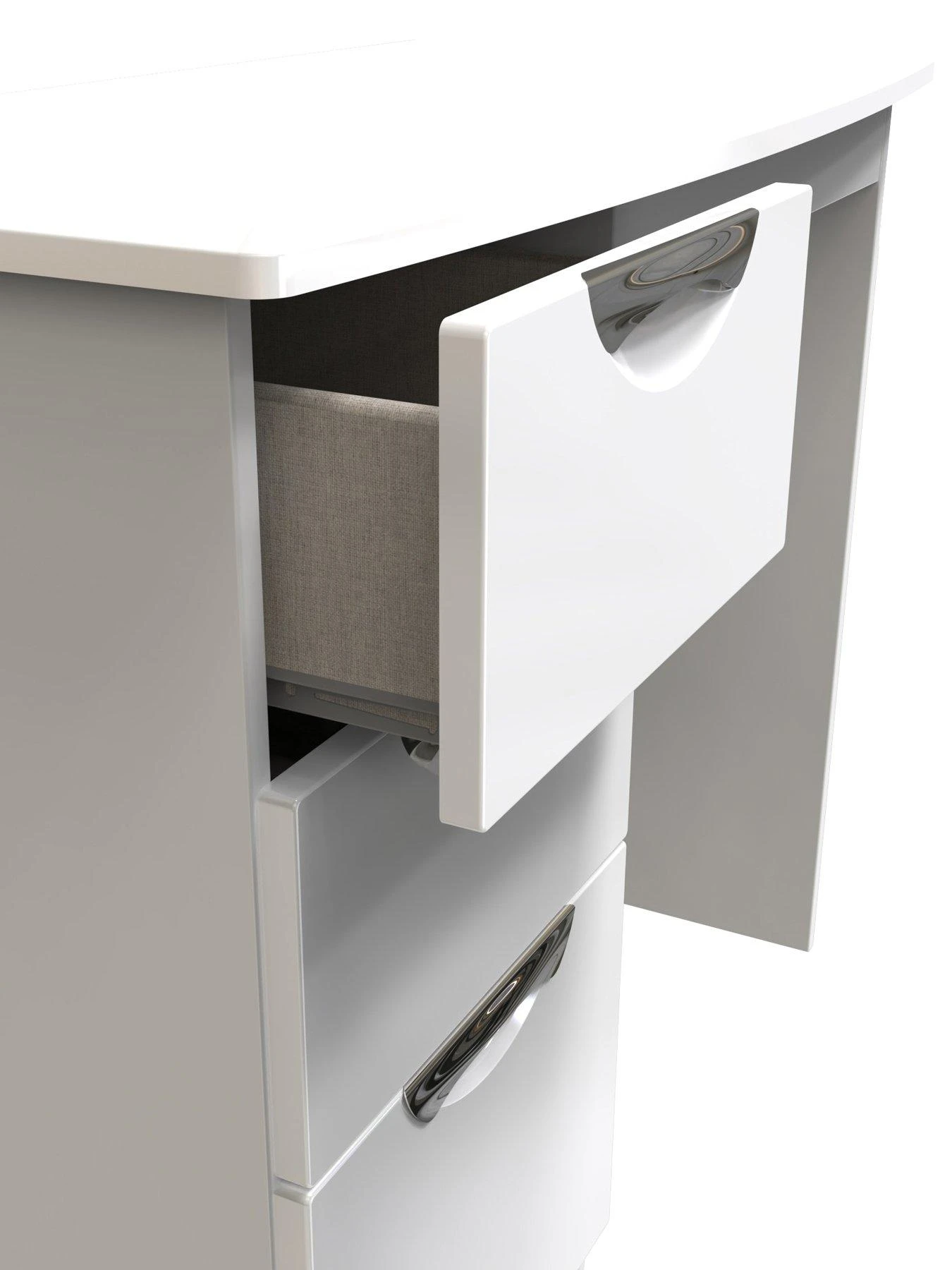 All drawers are finished with ultra-modern metal inset handles, then lined in a linen-effect to keep them looking as good on the inside as they do on the outside. They open and close smoothly (and quietly) on easy-glide metal runners.