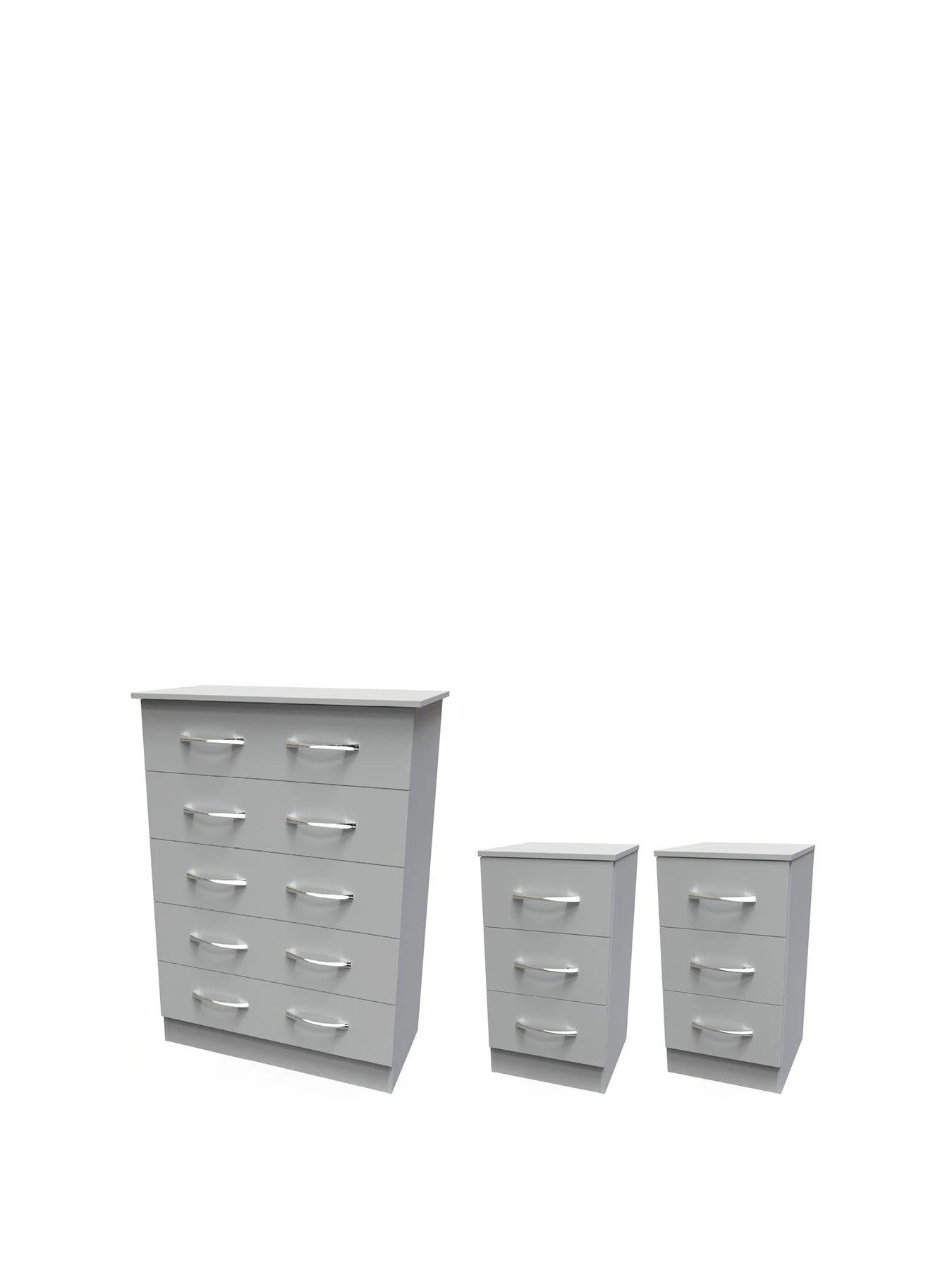 This great value 3 Piece Ready Assembled Elton Bedroom Furniture Set by SWIFT comprises a Chest of 5 Drawers and a Pair of 3 Drawer Bedside Chests – FSC® Certified