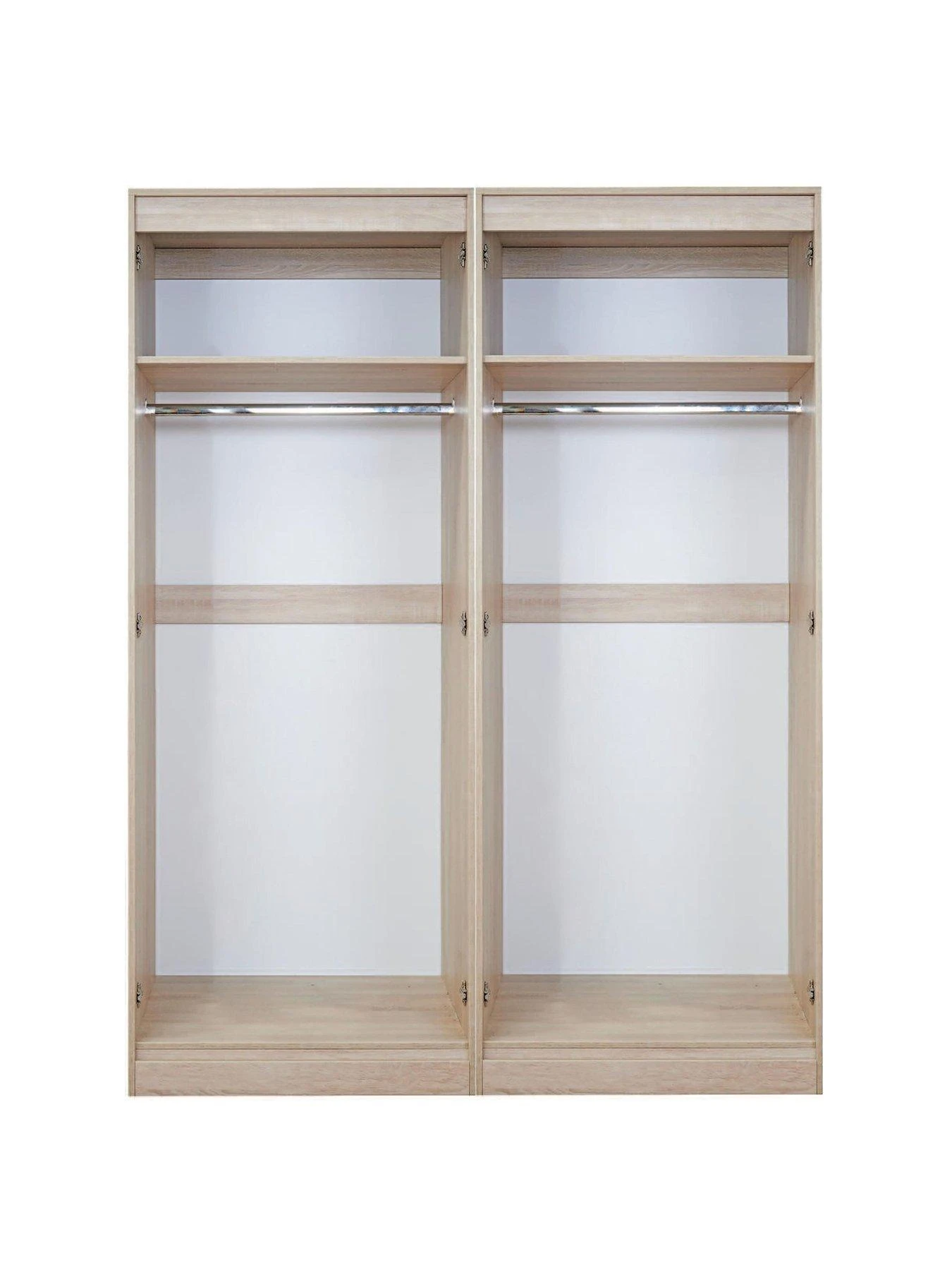 Slimline metal handles finish the look, and the two internal sections each hold a metal hanging rail and high shelf.