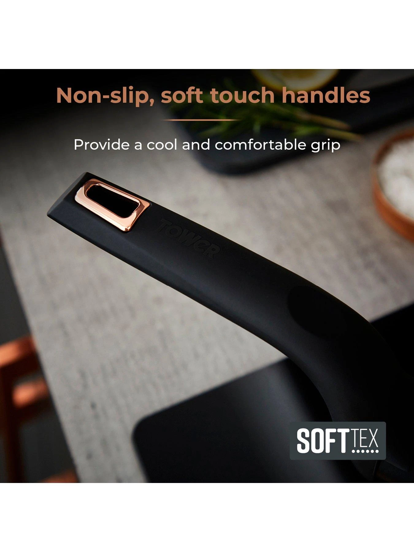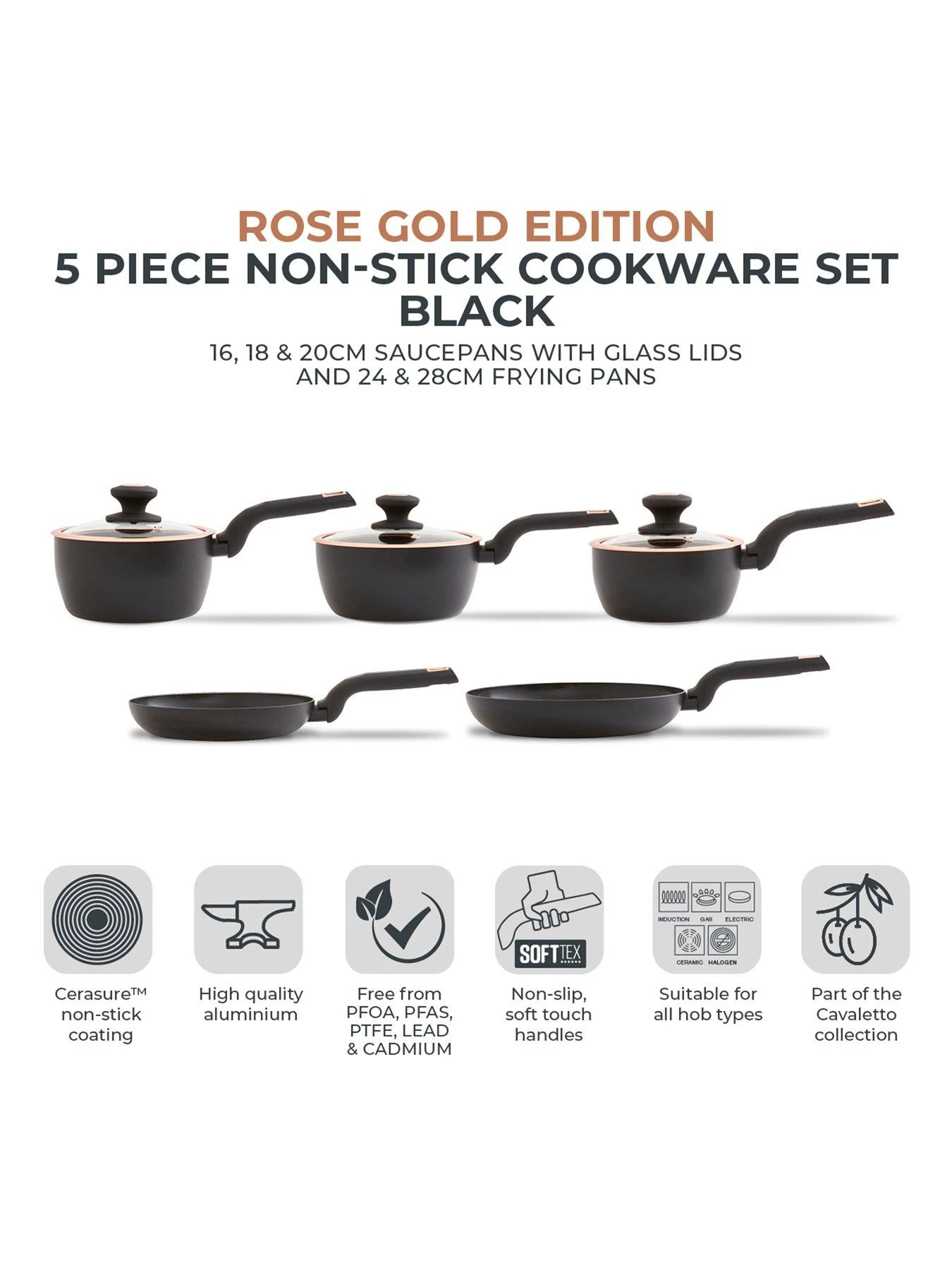 - SOFTTEX HANDLES: Each pan features softtex handles in an elegant black and rose gold finish, for maximum comfort and style when cooking