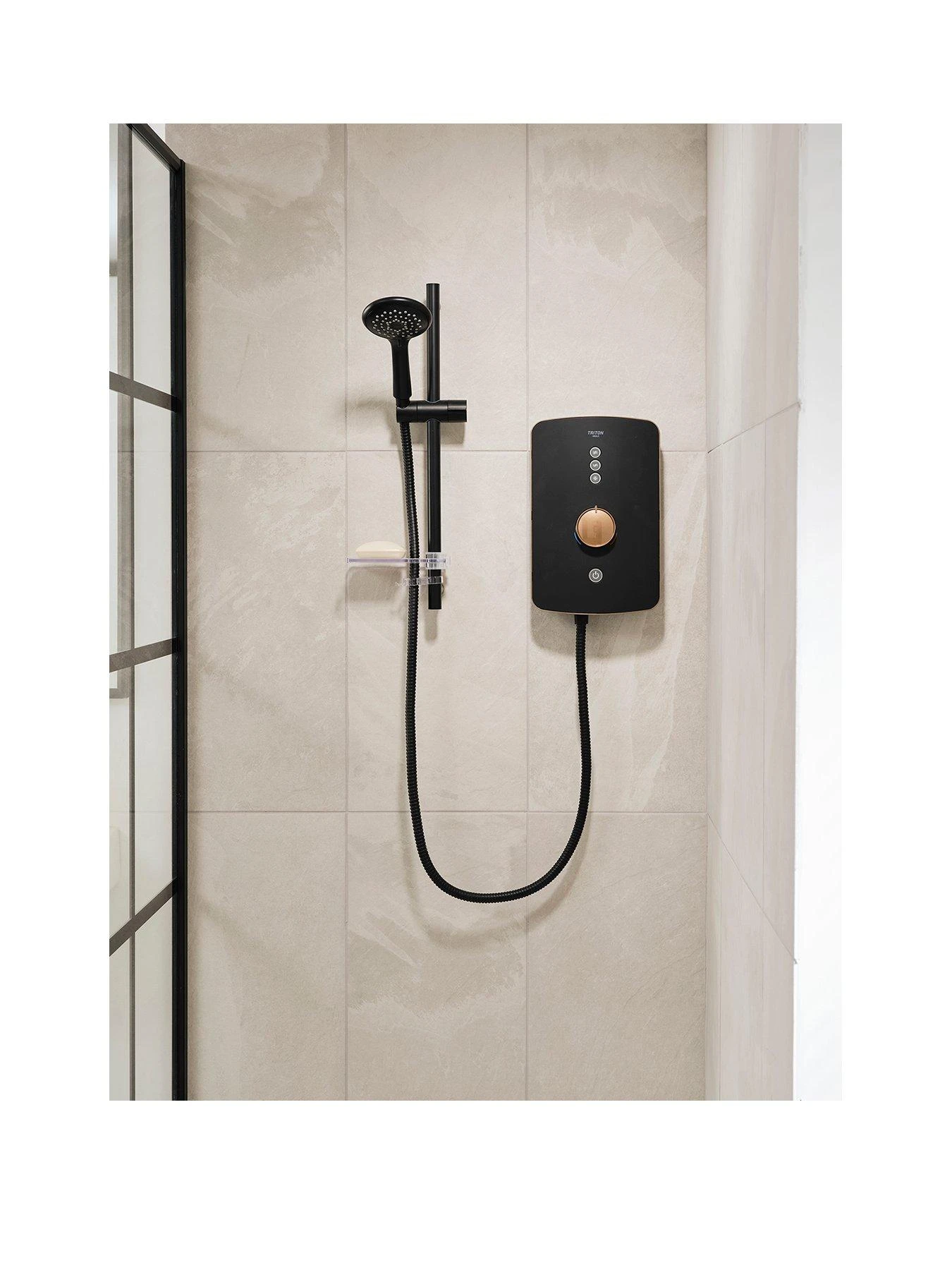 In black with brushed copper highlights, it uses illuminated soft-touch buttons to switch on, switch off, and change the flow power. Standard dial temperature controls also mean you can keep your favourite setting from shower to shower. Â