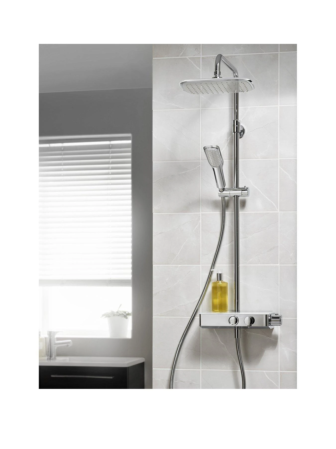 This contemporary chrome finish bar diverter mixer shower features a push button to make switching between the single spray pattern shower handset and fixed (rainfall) shower head easy whilst showering. Further functionality comes in the form of thermostatic temperature control, ensuring the shower holds a constant temperature for safe family showering, and a stylish shelf, useful for placing a shampoo bottle.