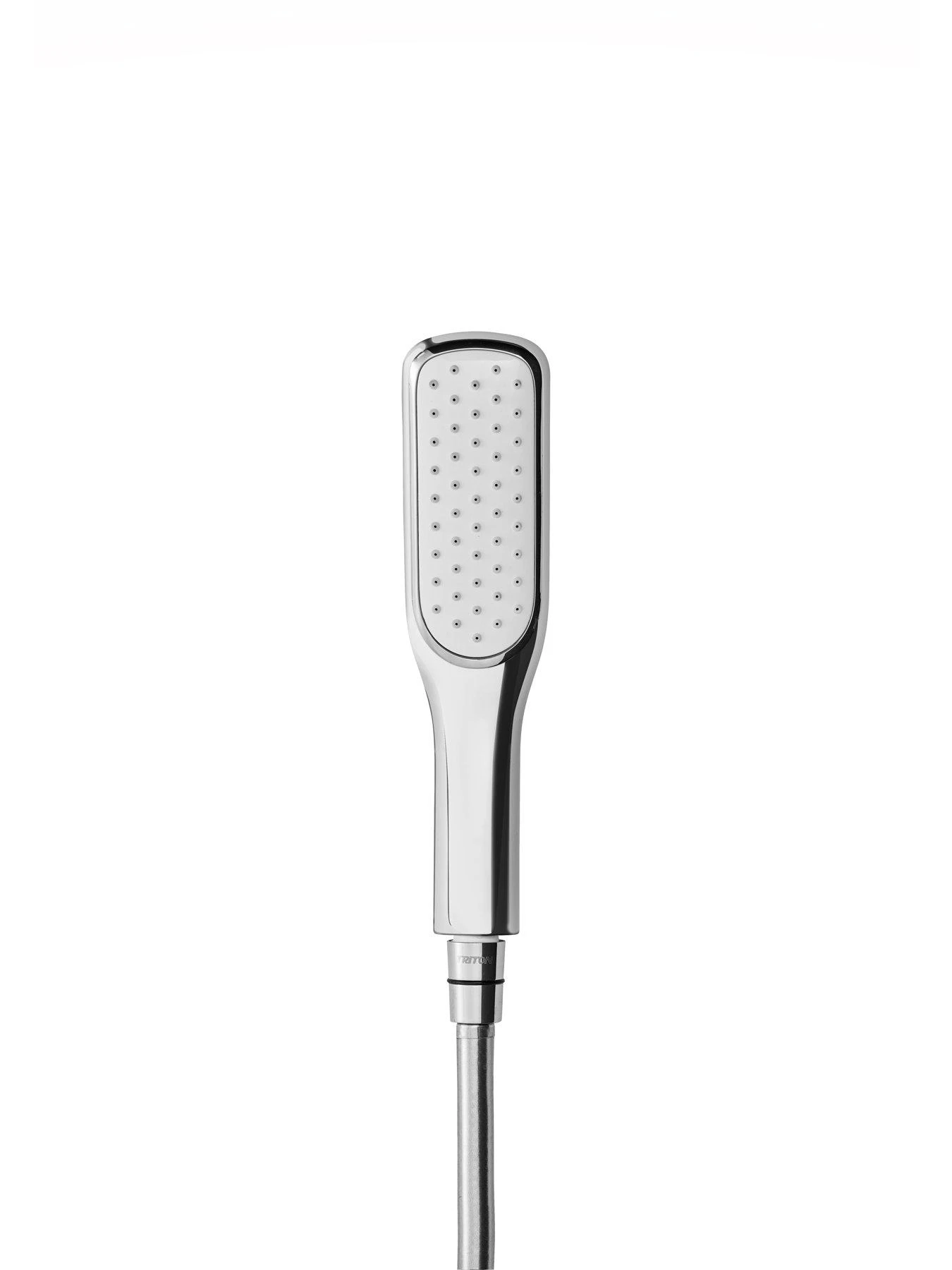 - Push button diverter – Easily divert flow between single spray pattern handset and overhead fixed (rainfall) shower drencher.