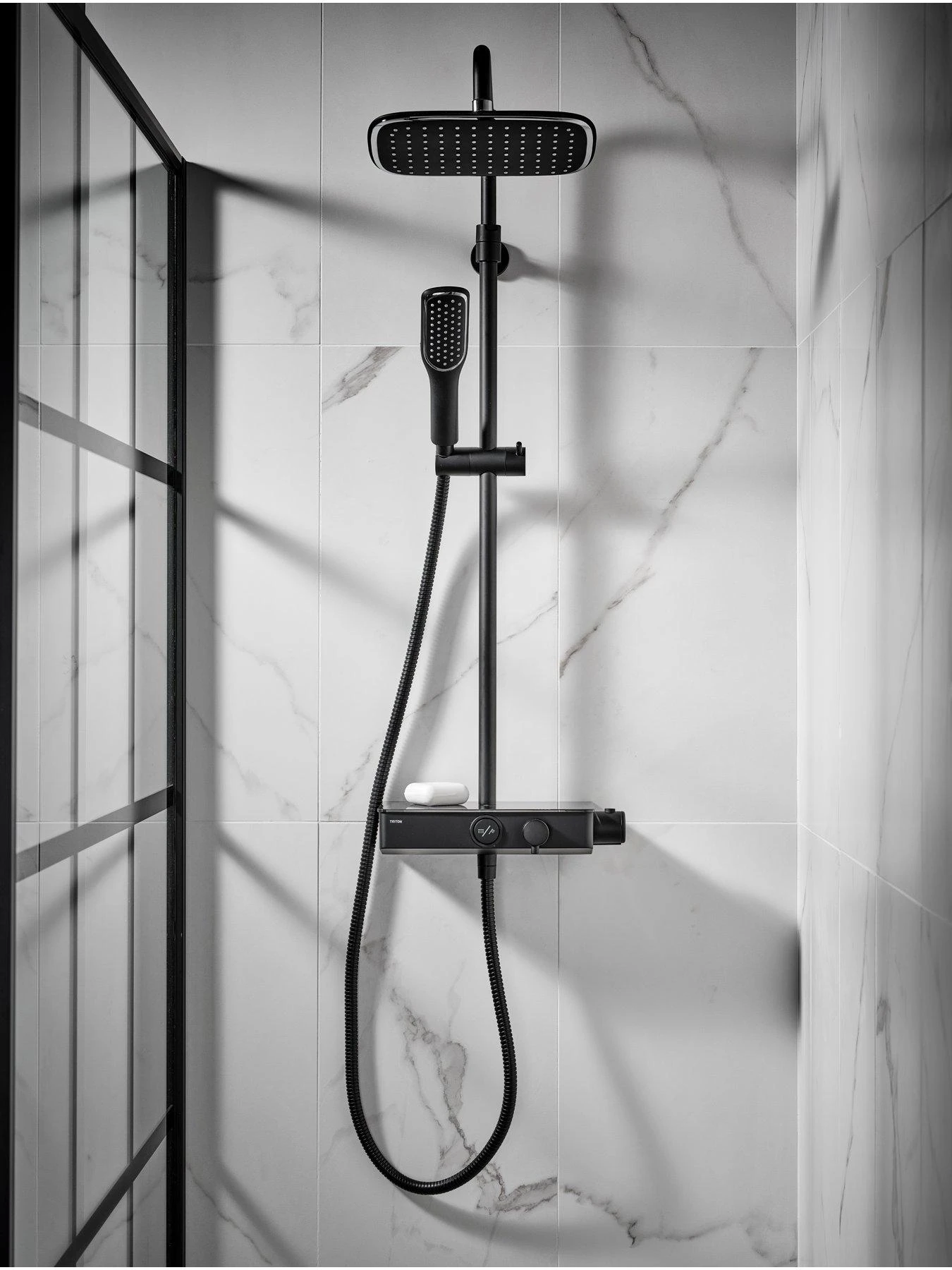 This contemporary matte black bar diverter mixer shower features a push button to make switching between the single spray pattern shower handset and fixed (rainfall) shower head easy whilst showering. Further functionality comes in the form of thermostatic temperature control, ensuring the shower holds a constant temperature for safe family showering, and a stylish gloss black safety glass shelf, useful for placing a shampoo for example