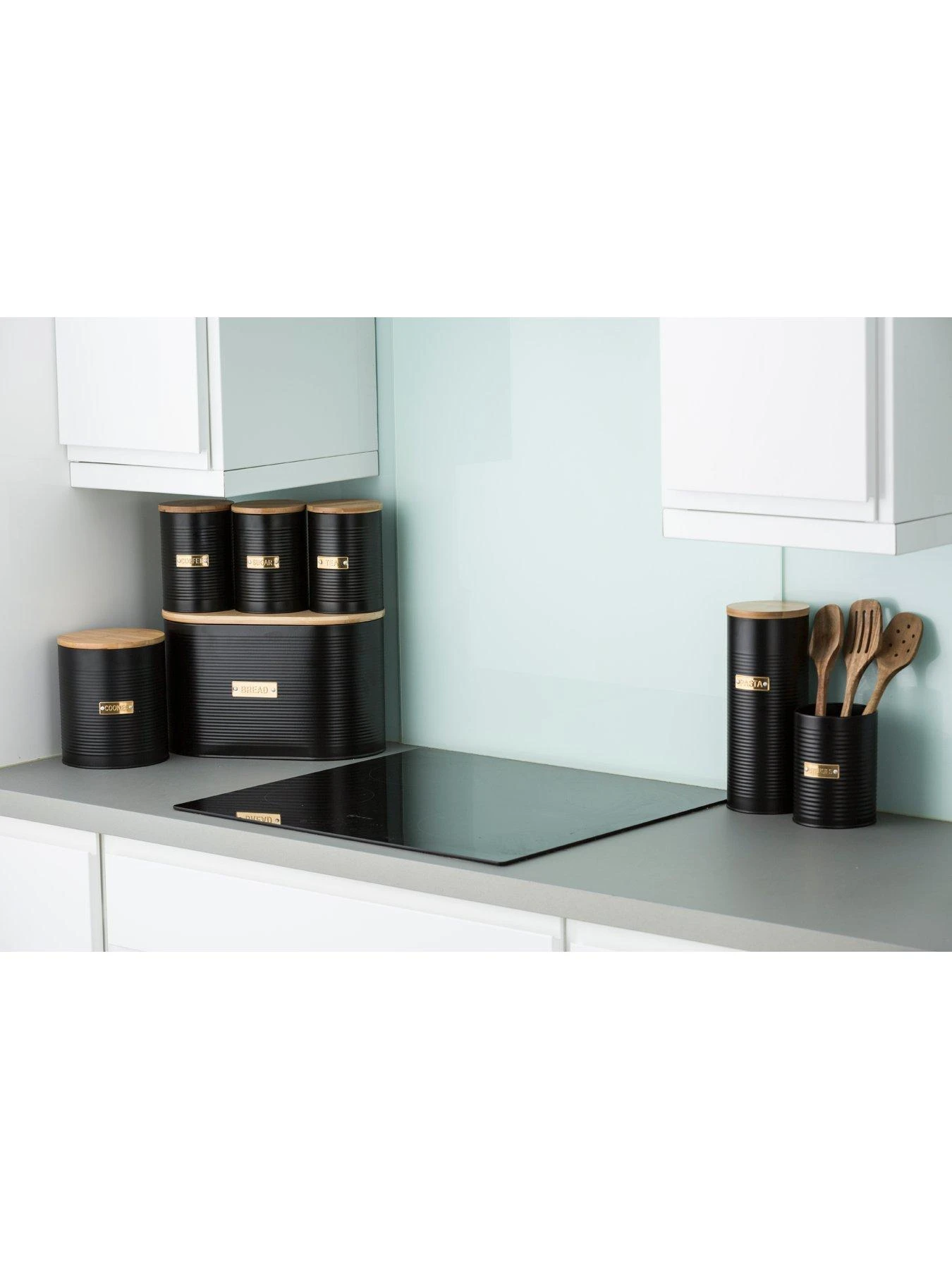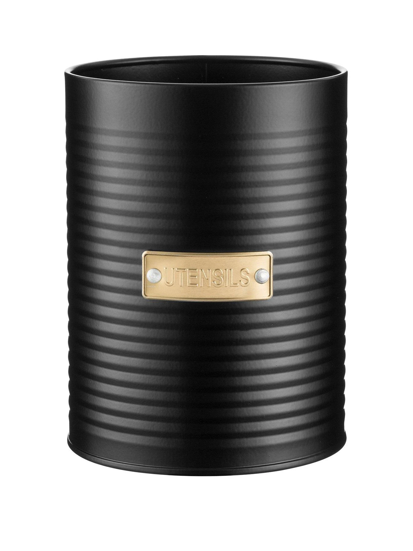 Made from hardwearing carbon steel, it features an attractive ribbed design and is finished in a striking ebony colour scheme. A golden-toned plate across the front reads utensils, and there’s plenty of space inside for all of your cooking essentials.