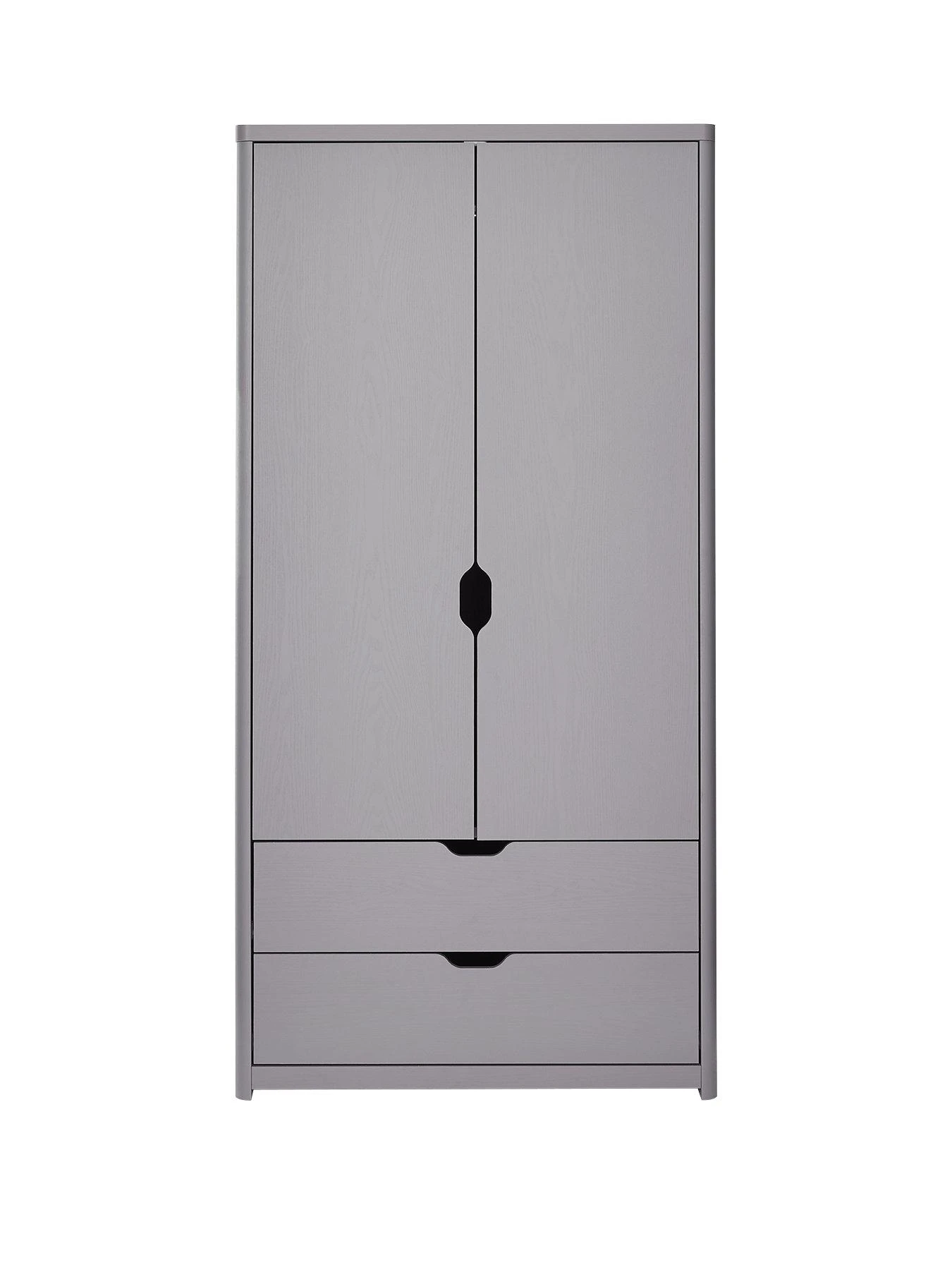 The 2 doors hide a handy amount of hanging space, while 2 drawers offer added room for folded clothes. It’s styled with smooth rounded corners, curvy cut-out handles and easy-glide metal runners.