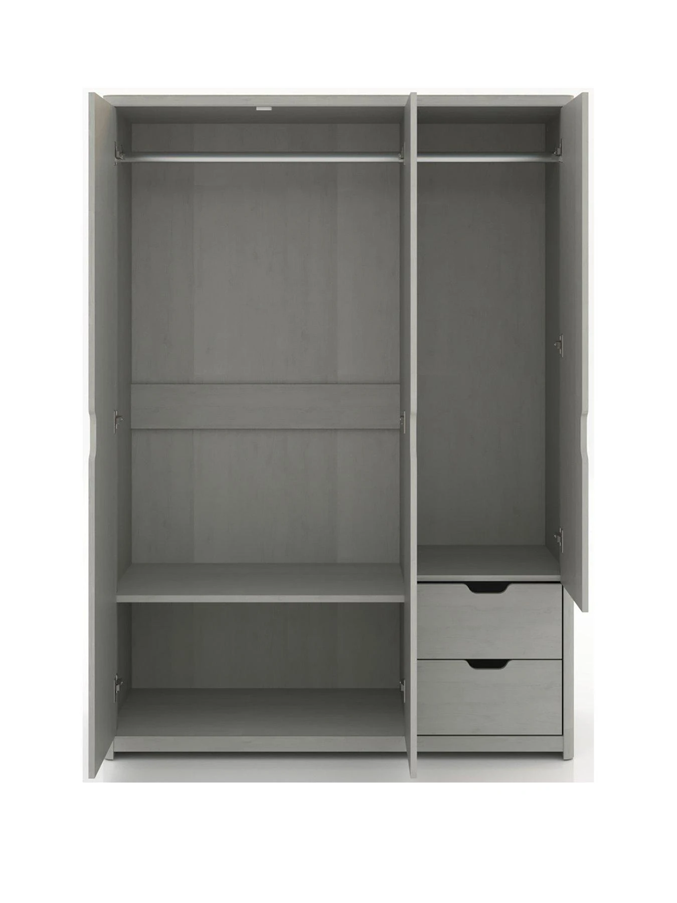 The 3 doors hide a handy amount of storage space, while 2 drawers offer added room for folded clothes. It’s styled with smooth rounded corners, curvy cut-out handles and easy-glide metal runners.