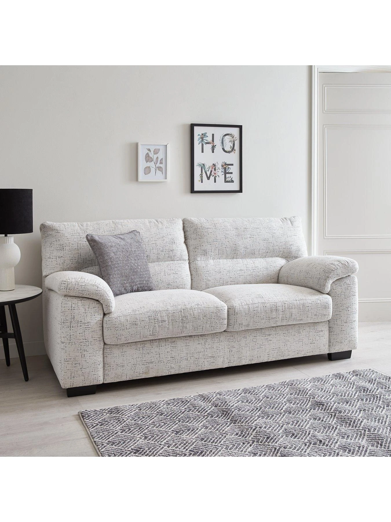 This Danielle sofa suite flaunts a fabulous woven fabric in a modern mottled natural colourway. With split back cushions, it features curved armpads that add some softness under your elbows, and sits on dark feet.