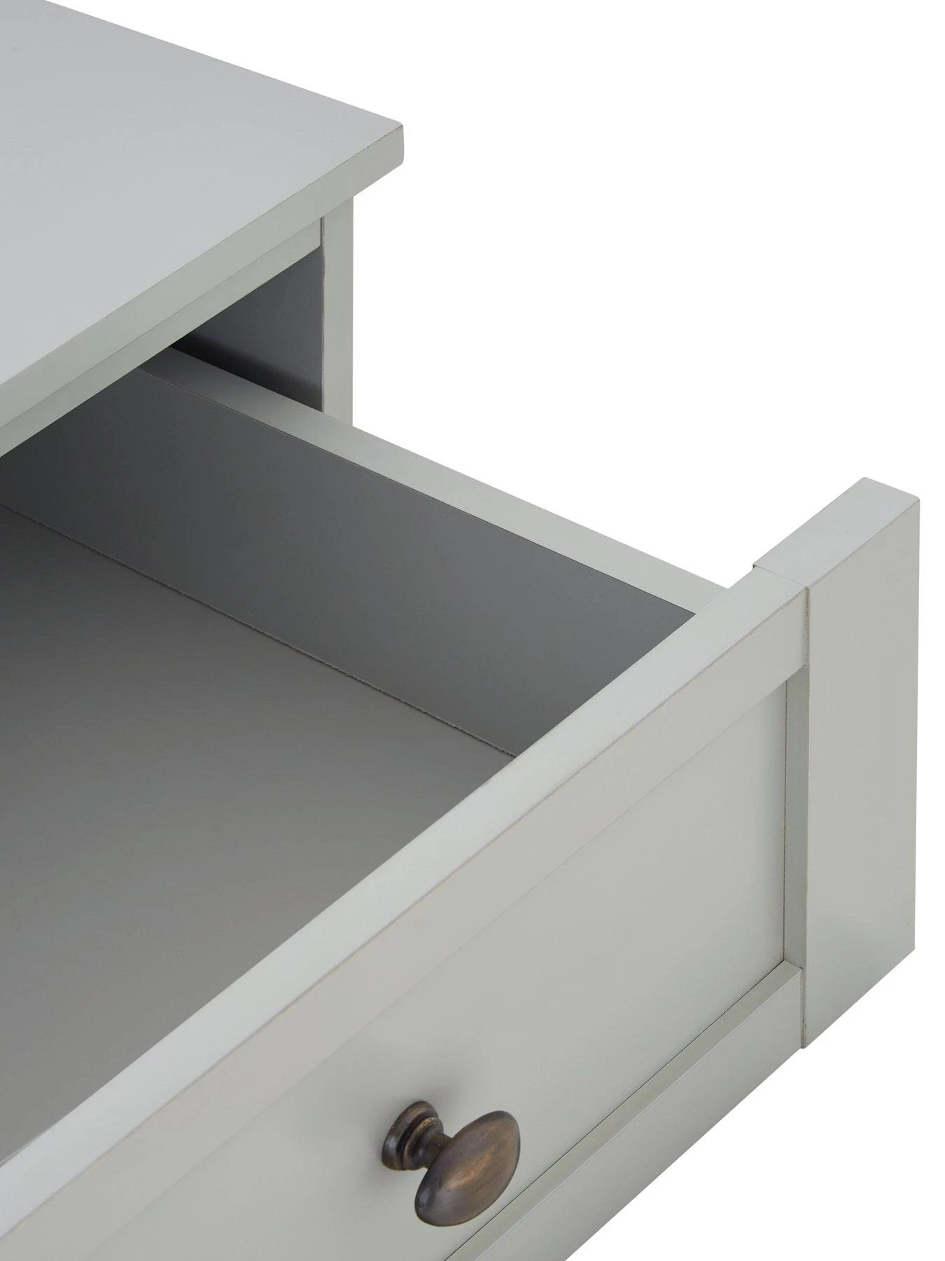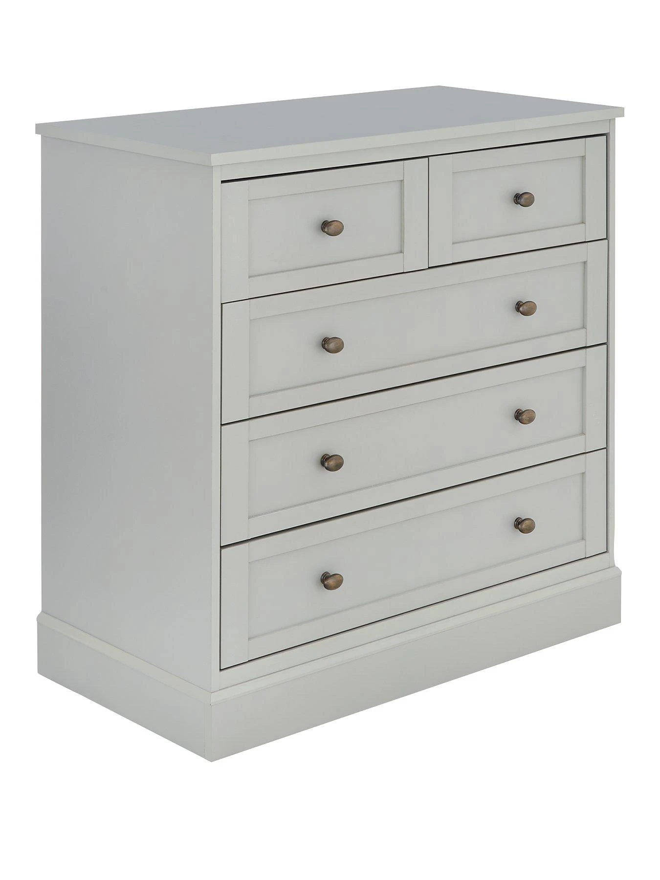 This chest of drawer from the Darcy collection is made from sturdy MDF, then wrapped in a smooth light grey finish. Sitting on a chunky plinth, its five drawers (three wide, two narrow) flaunt fashionable framing detail and they’re fitted with antique metal-effect handles and easy-glide metal runners.