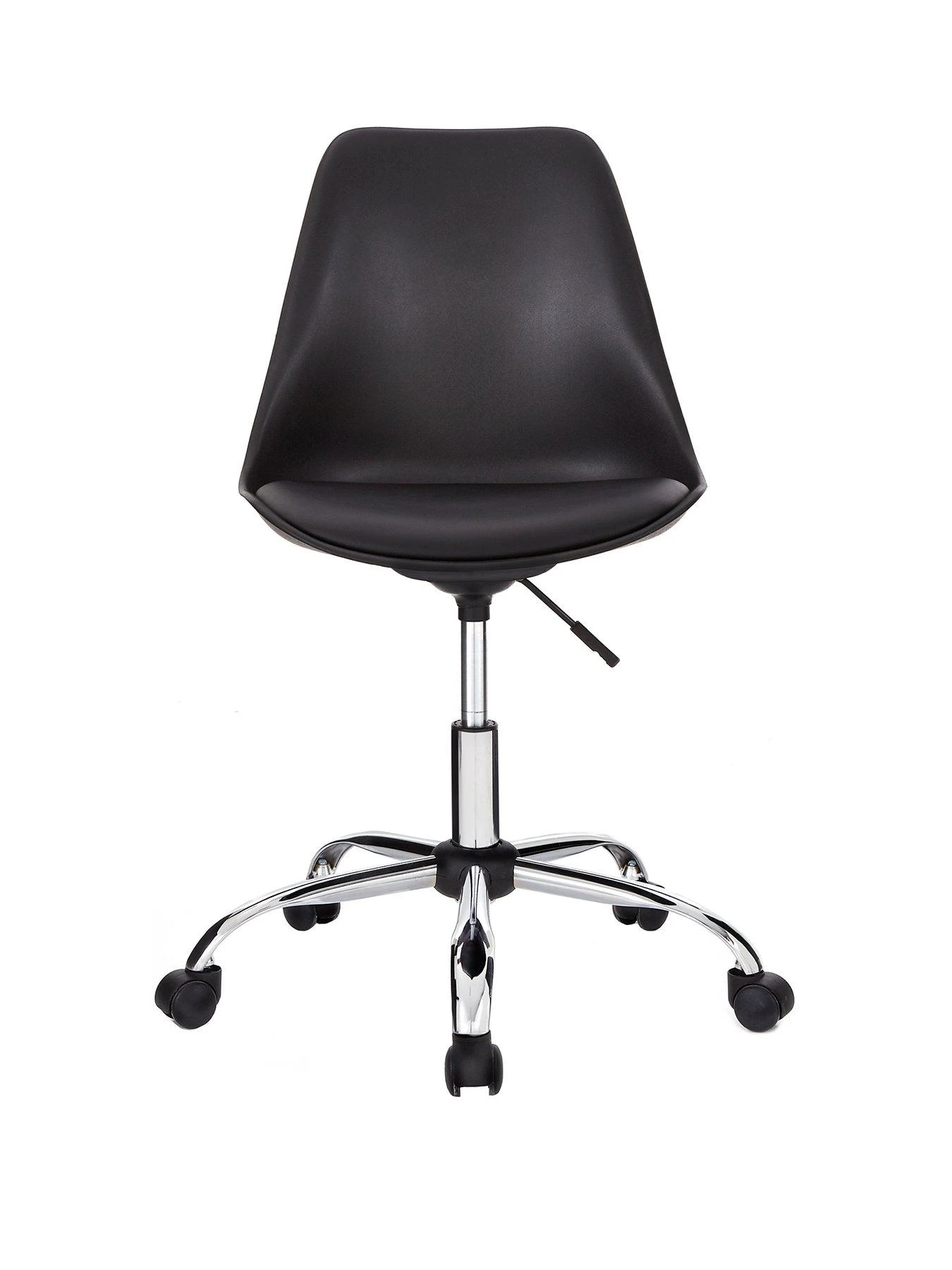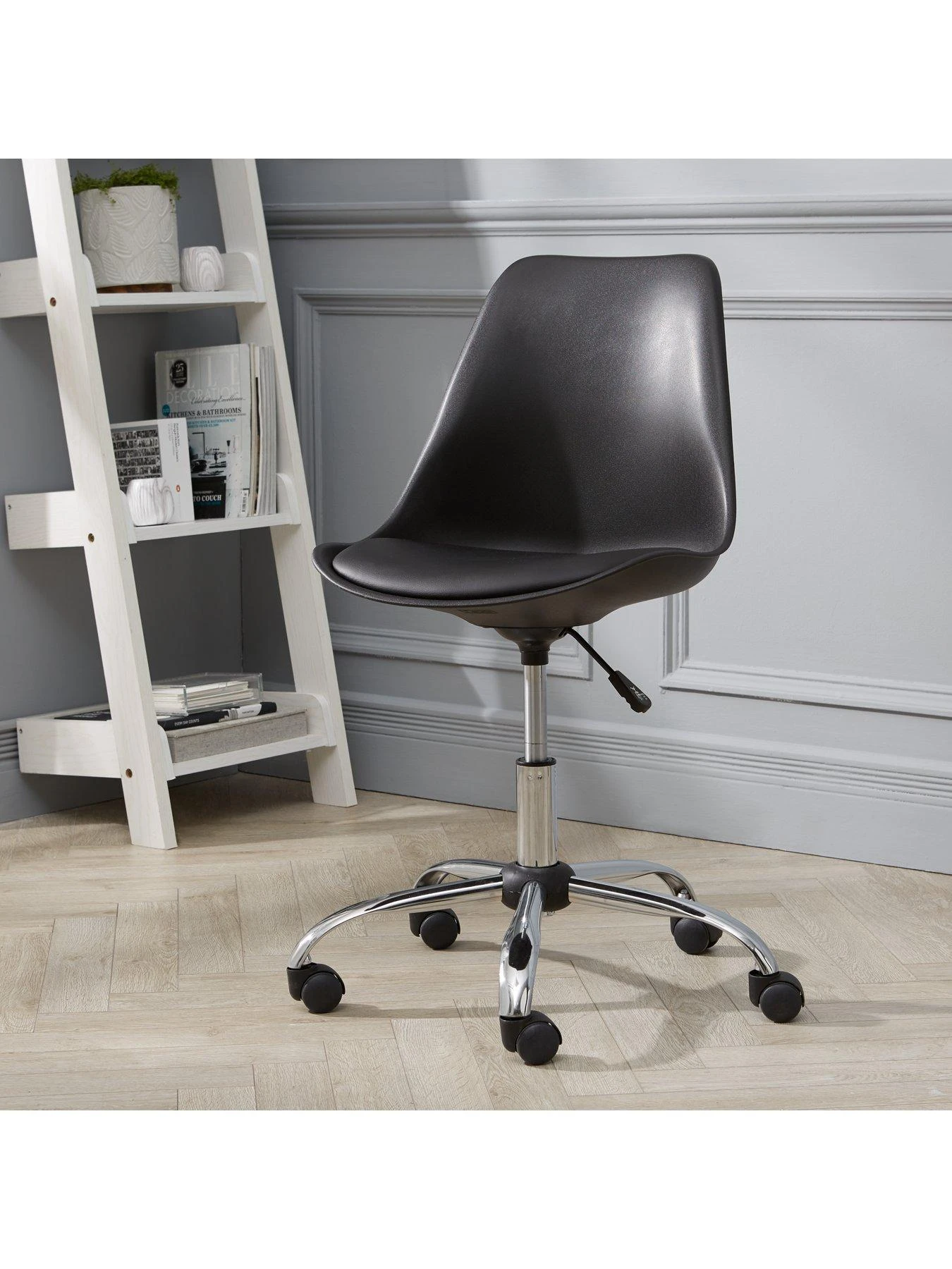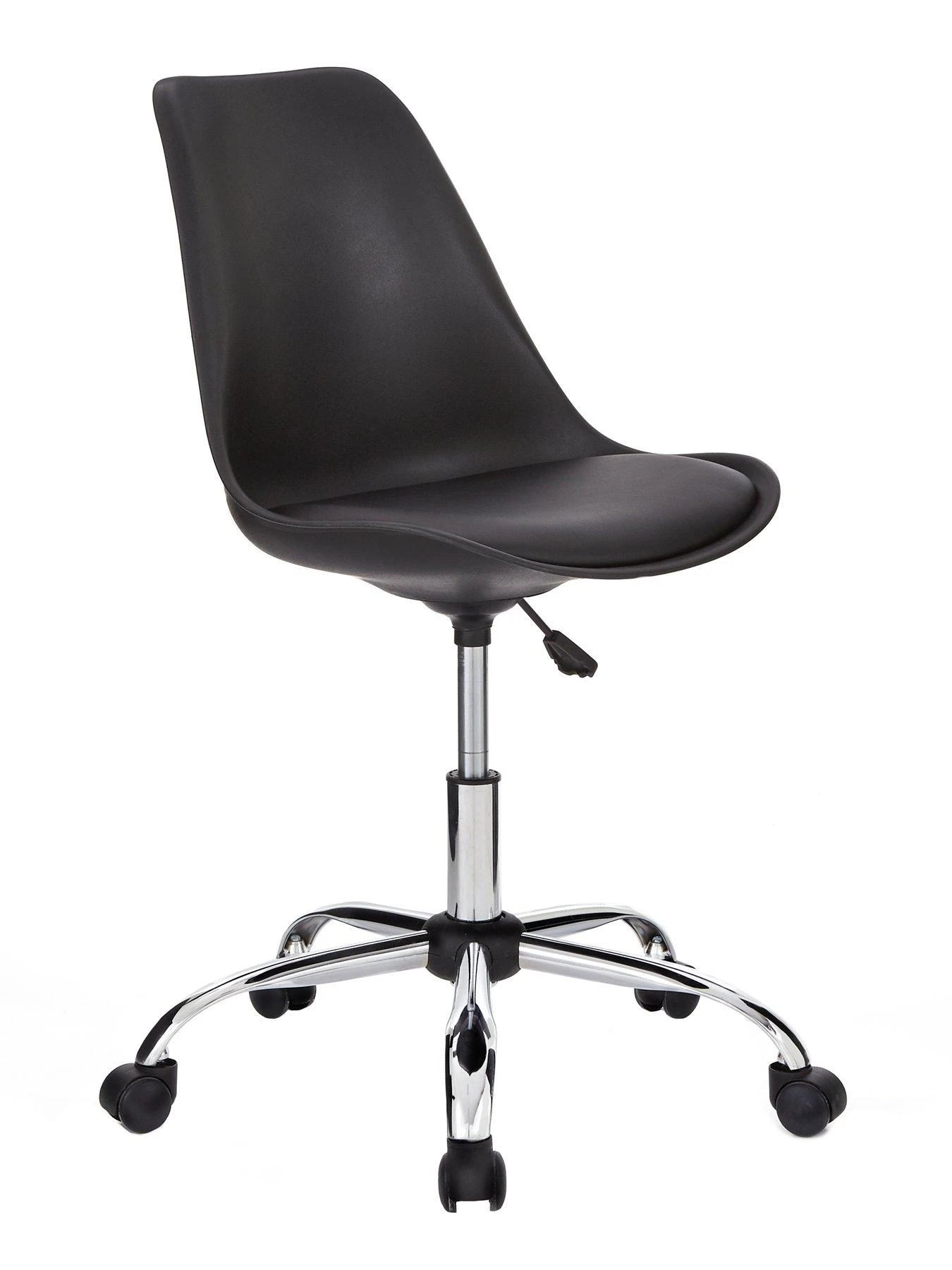 Sitting on a chrome base with castors for easy movement, its gas lift mechanism allows you to adjust the seat height to find your perfect position.