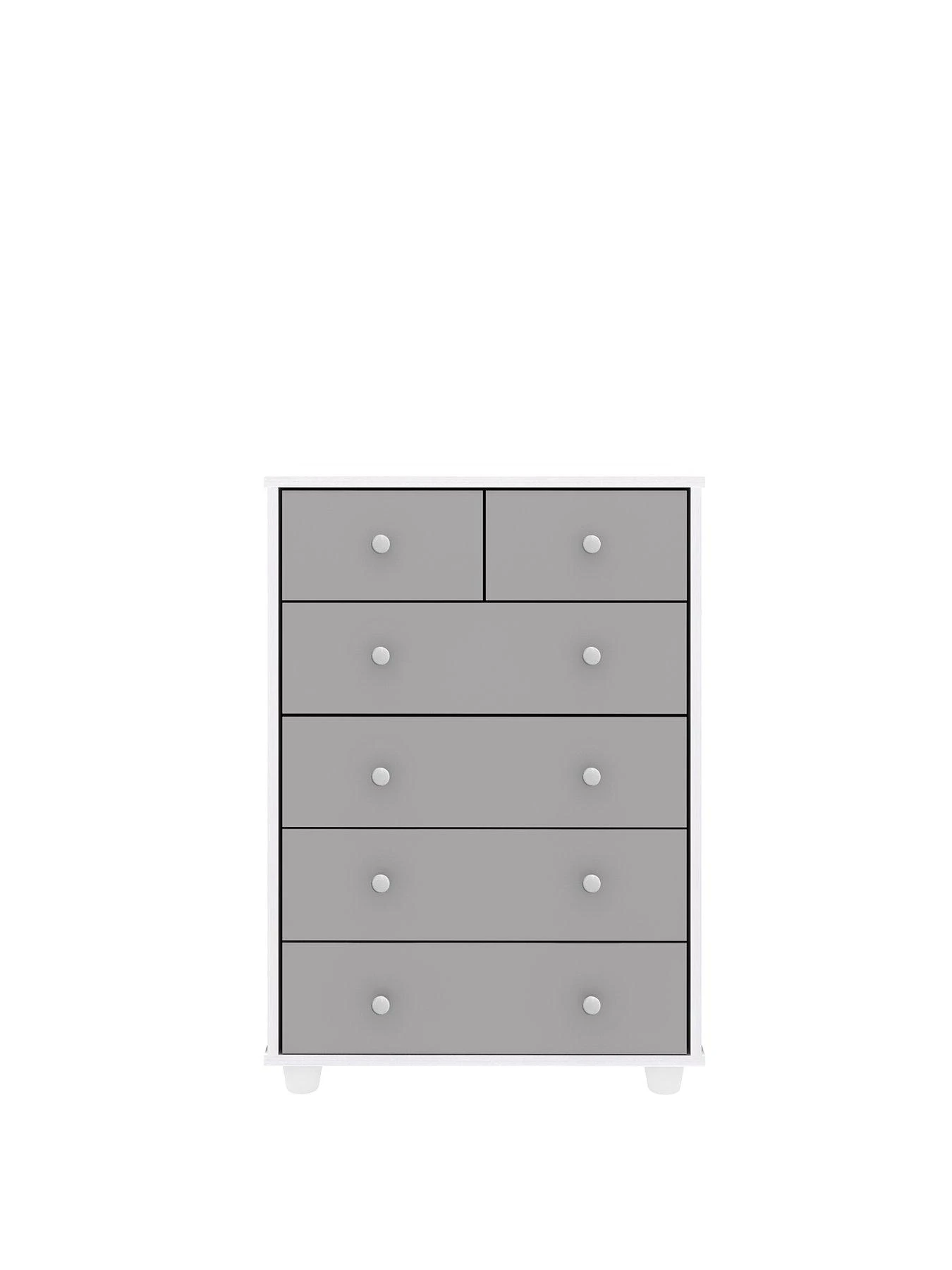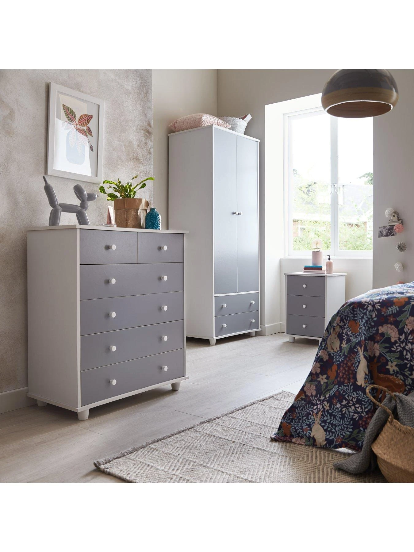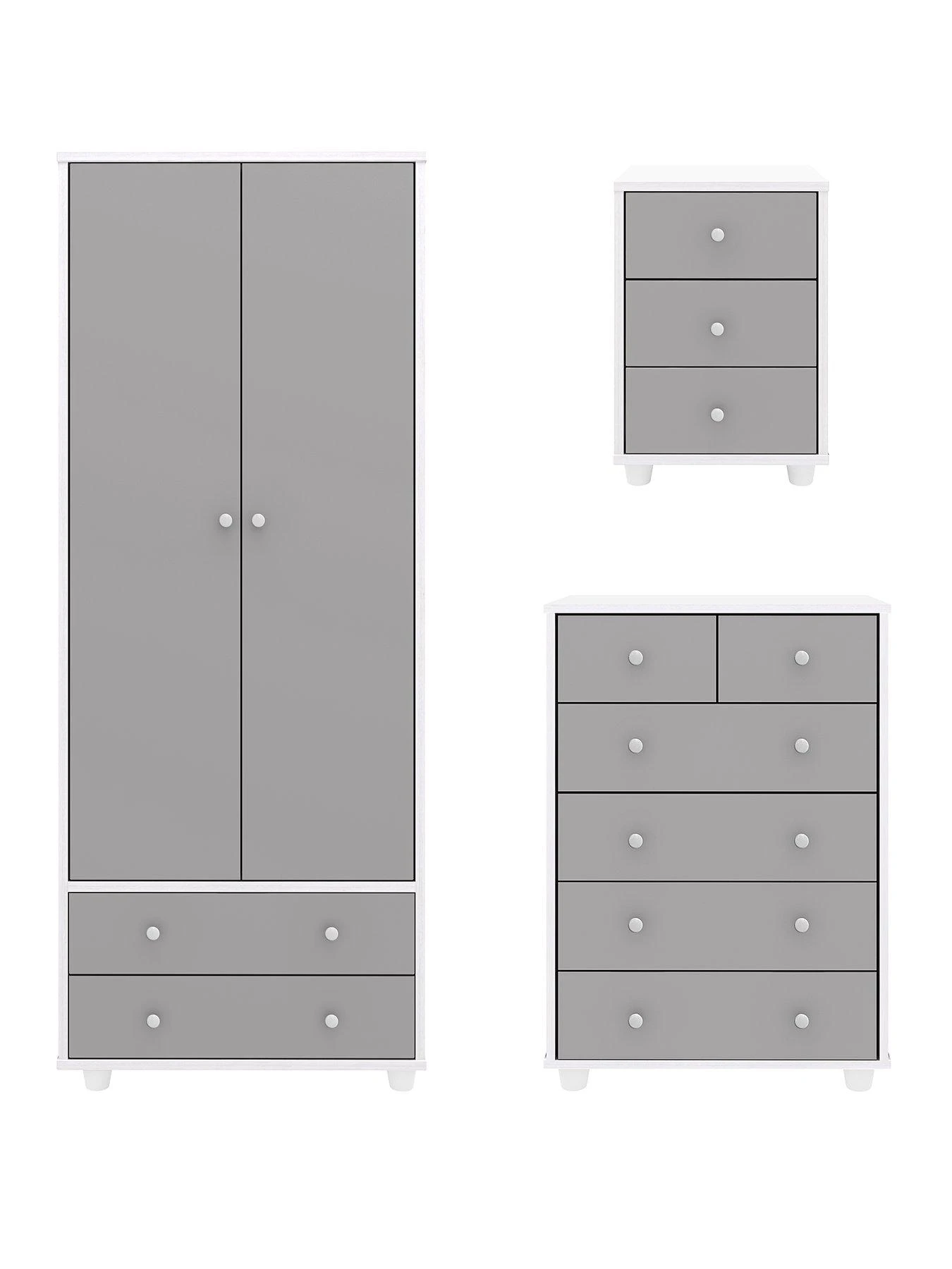 Superb value, this sunny Miami Fresh package is a great way to furnish your child’s bedroom in one easy purchase. Comprising a 2 door, 2 drawer wardrobe, chest of 5 drawers and a bedside chest, it features a white frame and contrasting grey doors and drawer fronts that are ideal for a slightly older look.