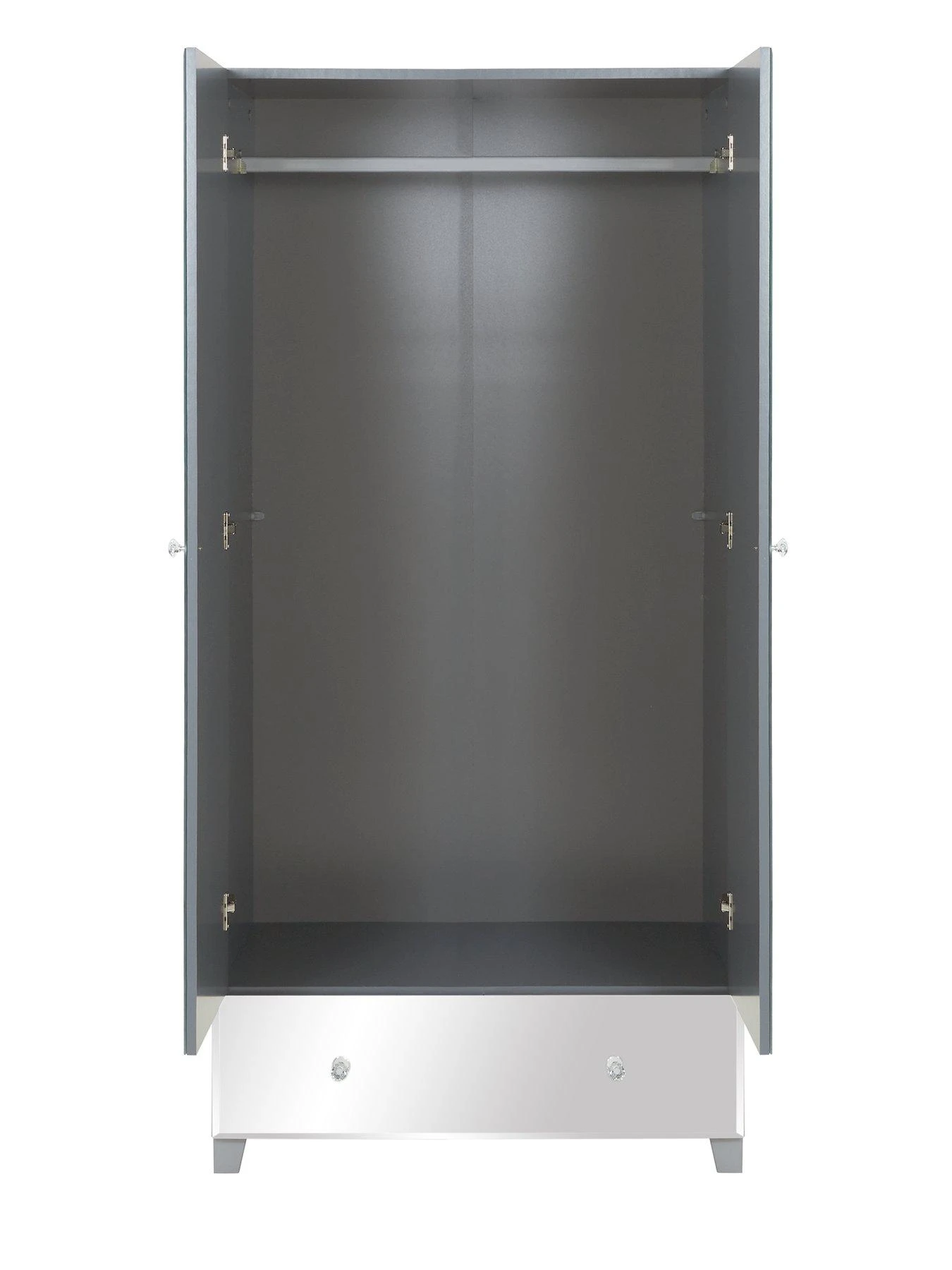 Just as fashionable as the outfits you’ll store in it, the doors and drawer front are decked in shiny bevelled mirrors that add a fabulous sense of light and depth to your space. Sparkly jewel-effect handles add a glam garnish, and the frame is available in white or grey colourways to match your room.