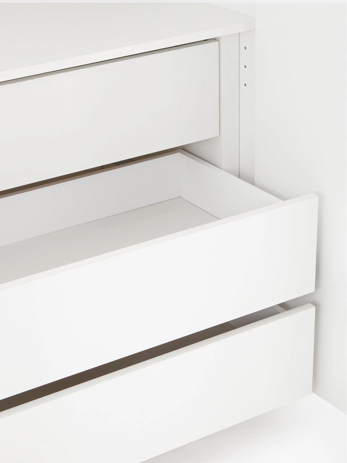 2 narrow outer sections each contain their own hanging rail and high shelf, while a wide middle section features a third hanging rail and 3 drawers for neat organisation of all your folded fashion.