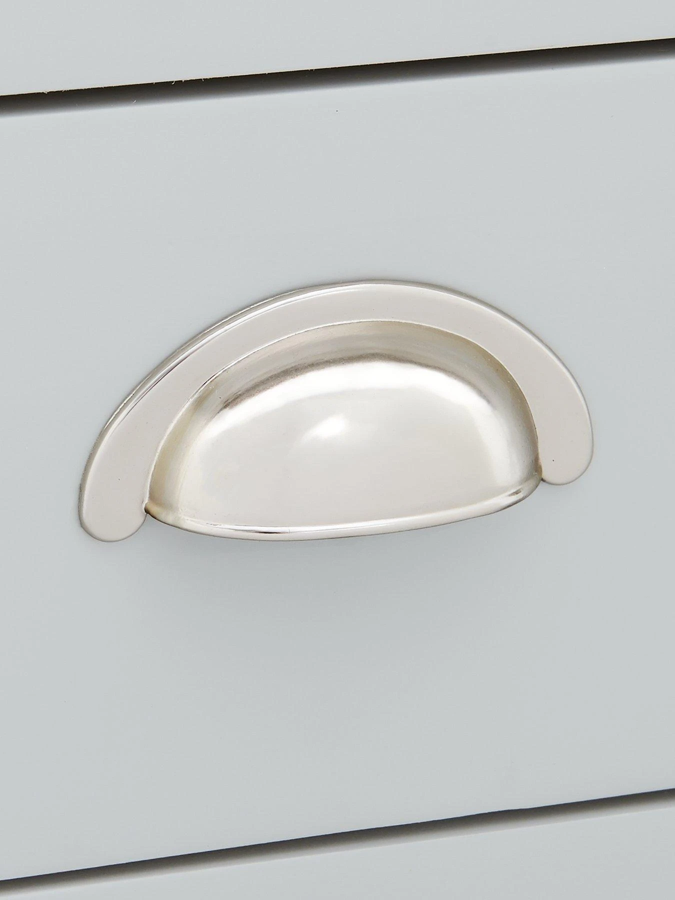 The open shelf is complemented by two storage drawers, each of which is accented with a shiny cup handle.