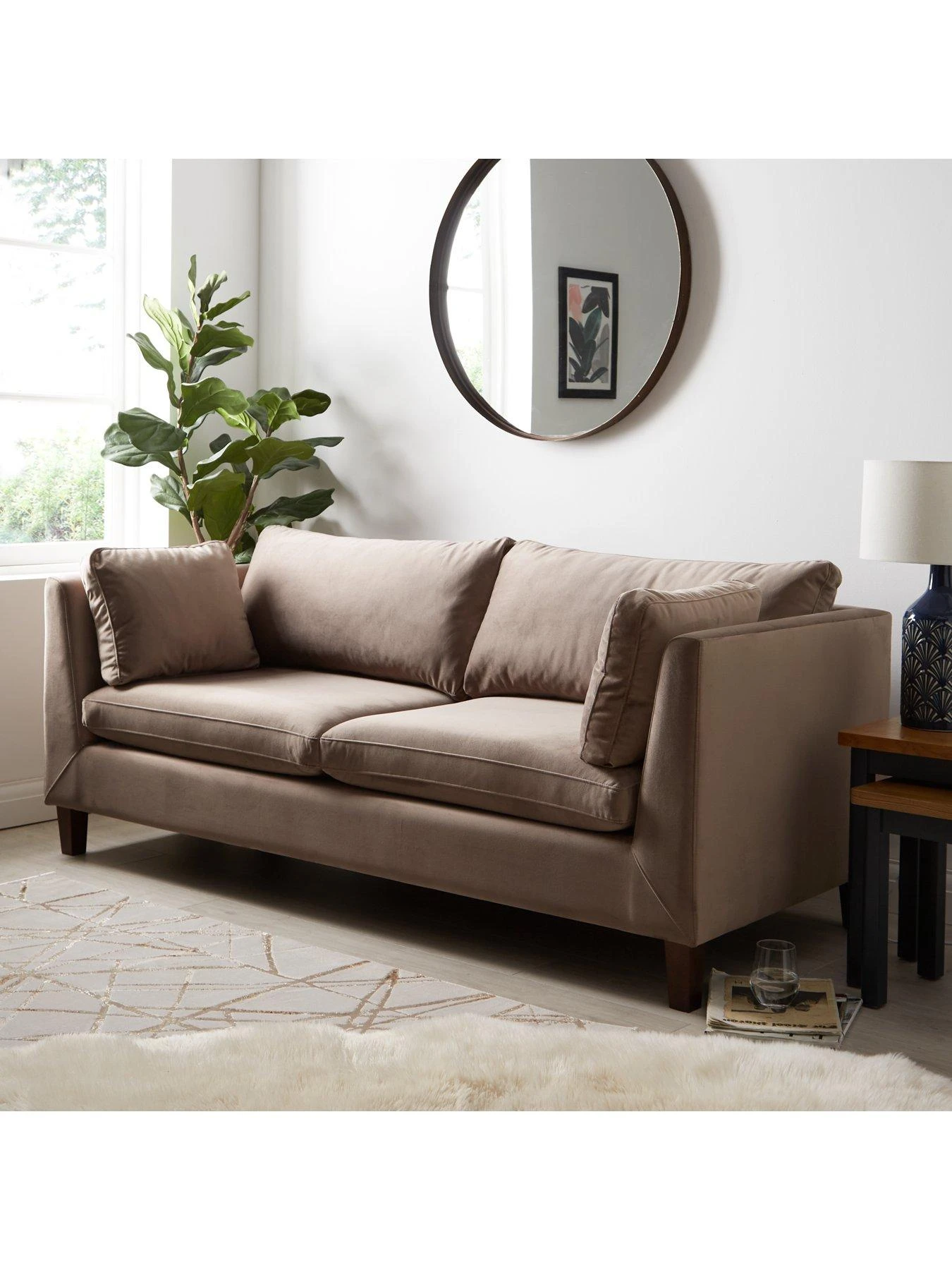 Stockholm has been upholstered in a sumptuously piled fabric that’s a touch sensation. A choice of taupe or rust colour options both brilliantly show off the contemporary silhouette’s sloping arms. Their slimline proportions contrast eye-catchingly with the plump side bolster cushions and their angle is echoed by the dark timber feet.