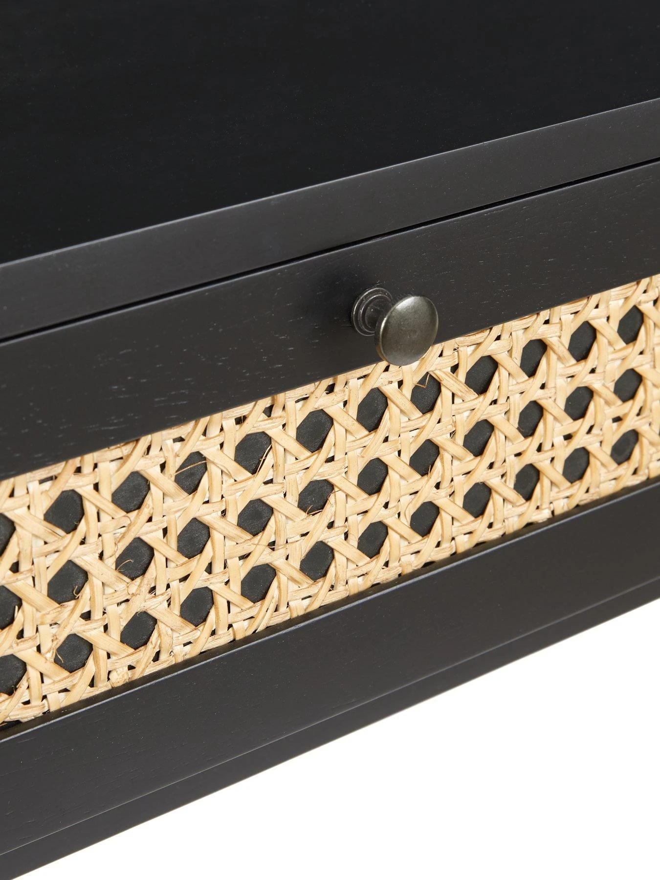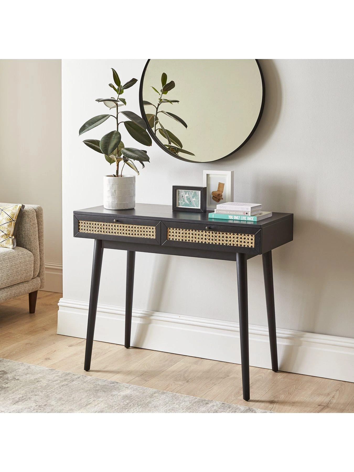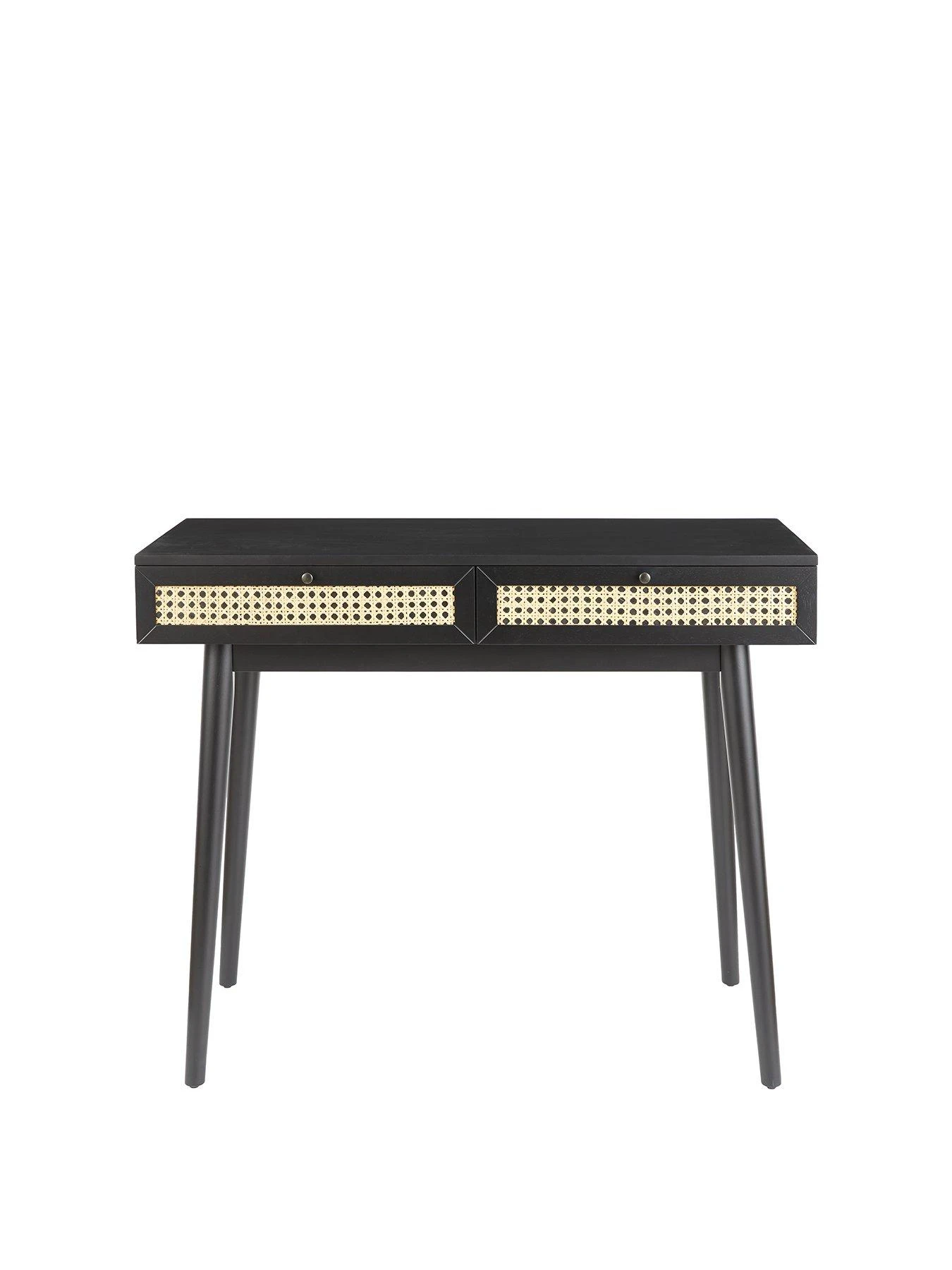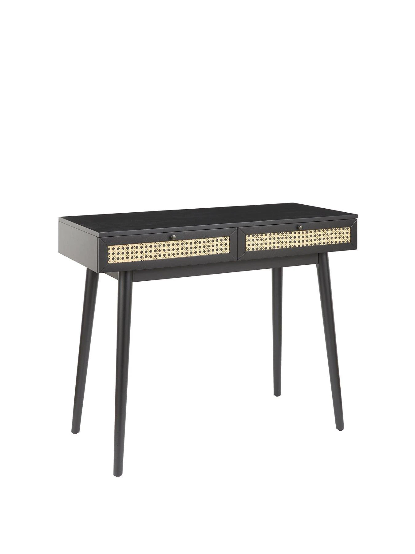 This console desk features a dramatic black finish and striking Scandi-style legs. The two drawers offer a handy hideaway for clutter and feature a framed design with fashionable cane webbing. The drawers are accented with metal handles and open on wooden runners.