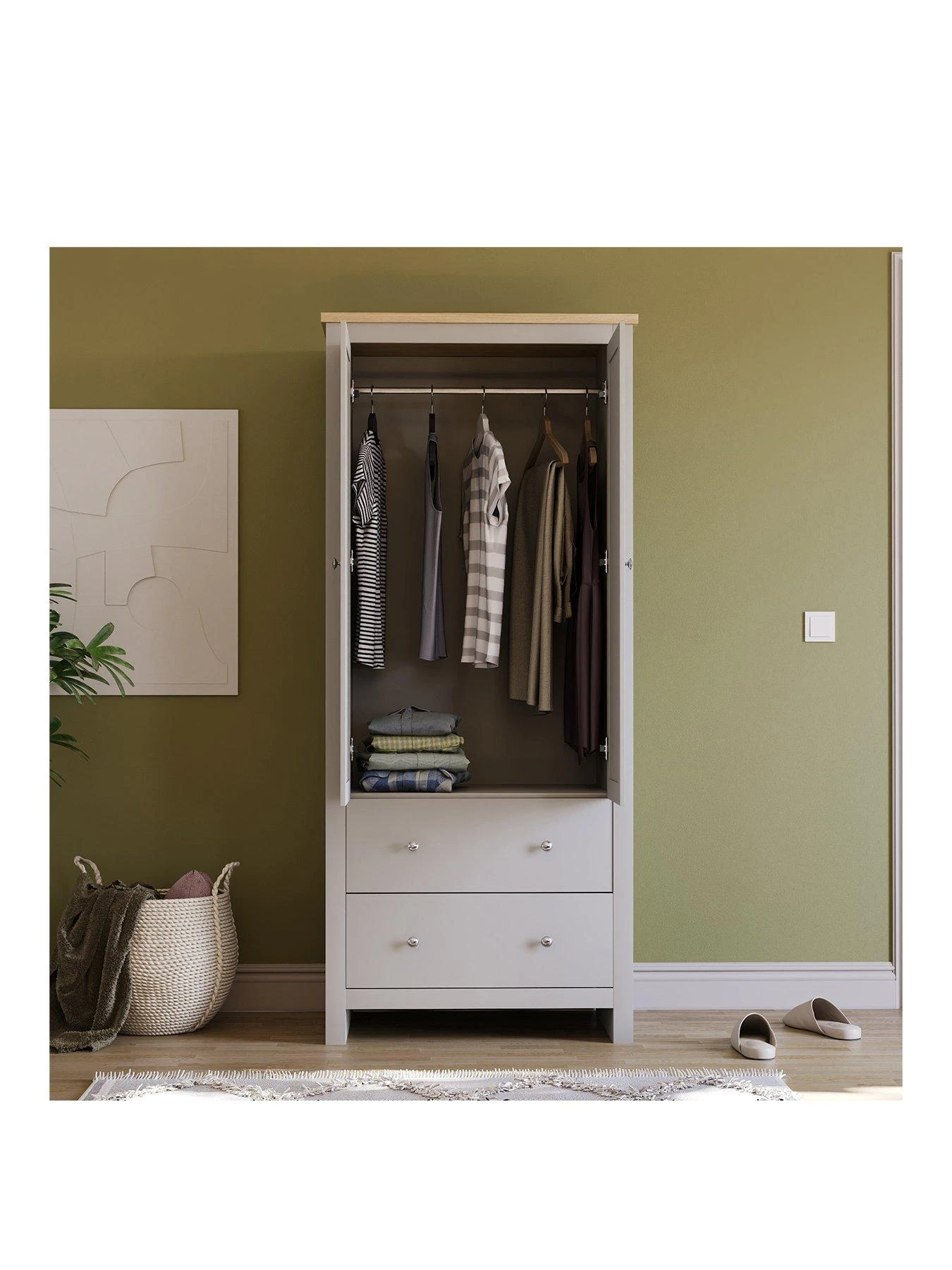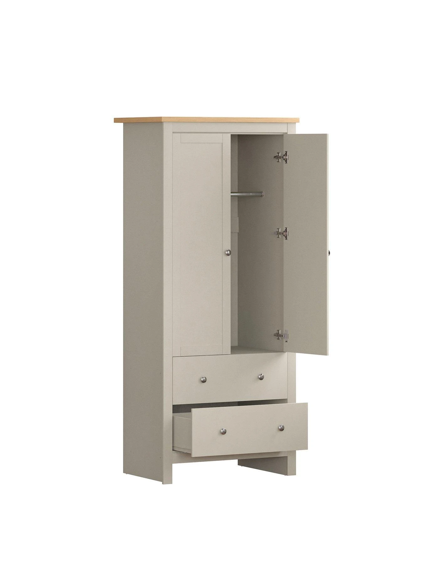 Styled with chunky sides for a substantial look, its 2 traditionally panelled doors hide a hanging rail for neat fashion storage. 2 deep drawers offer extra organisation space and sit on easy-glide metal runners that result in a smooth open/close action.