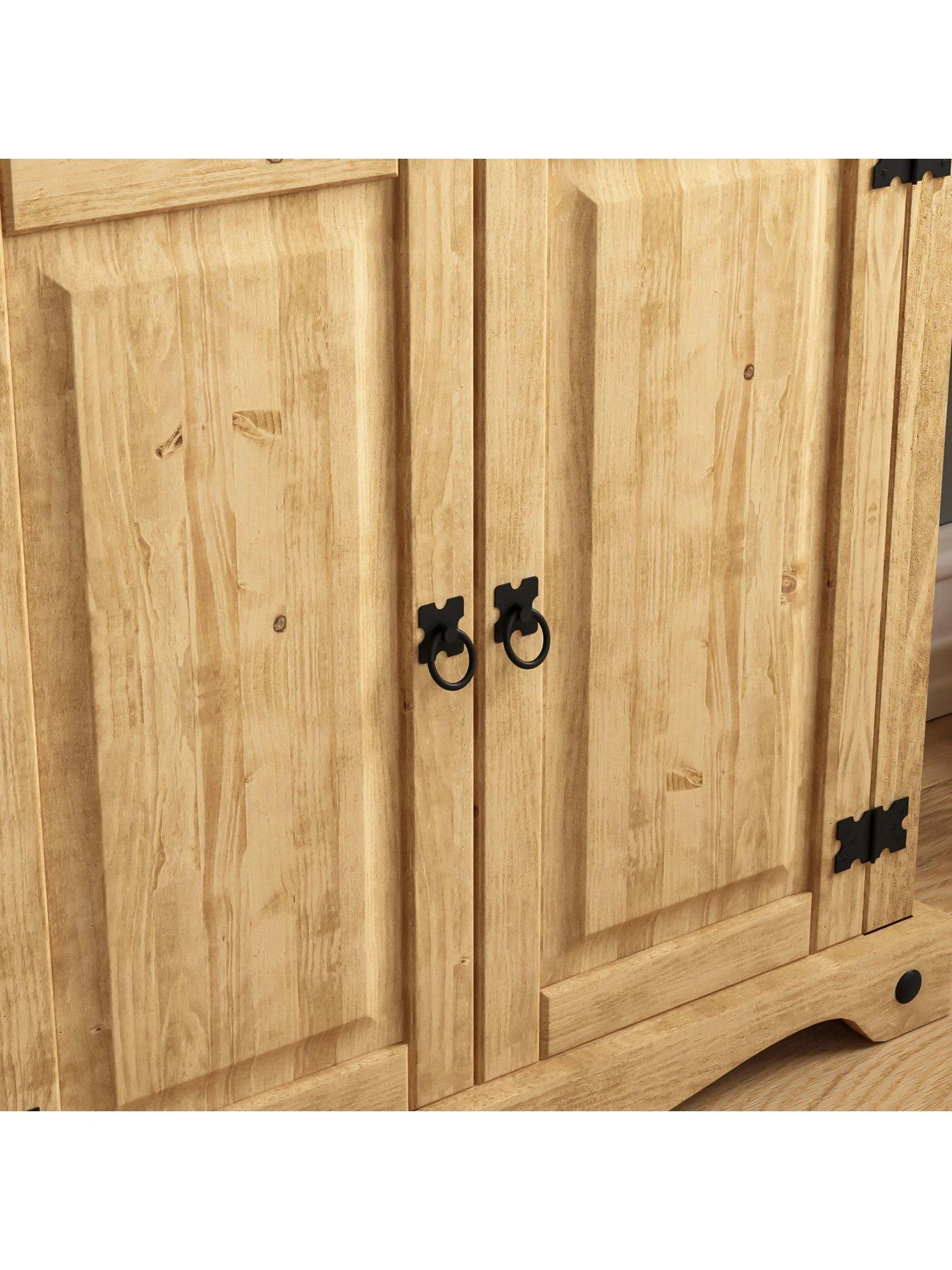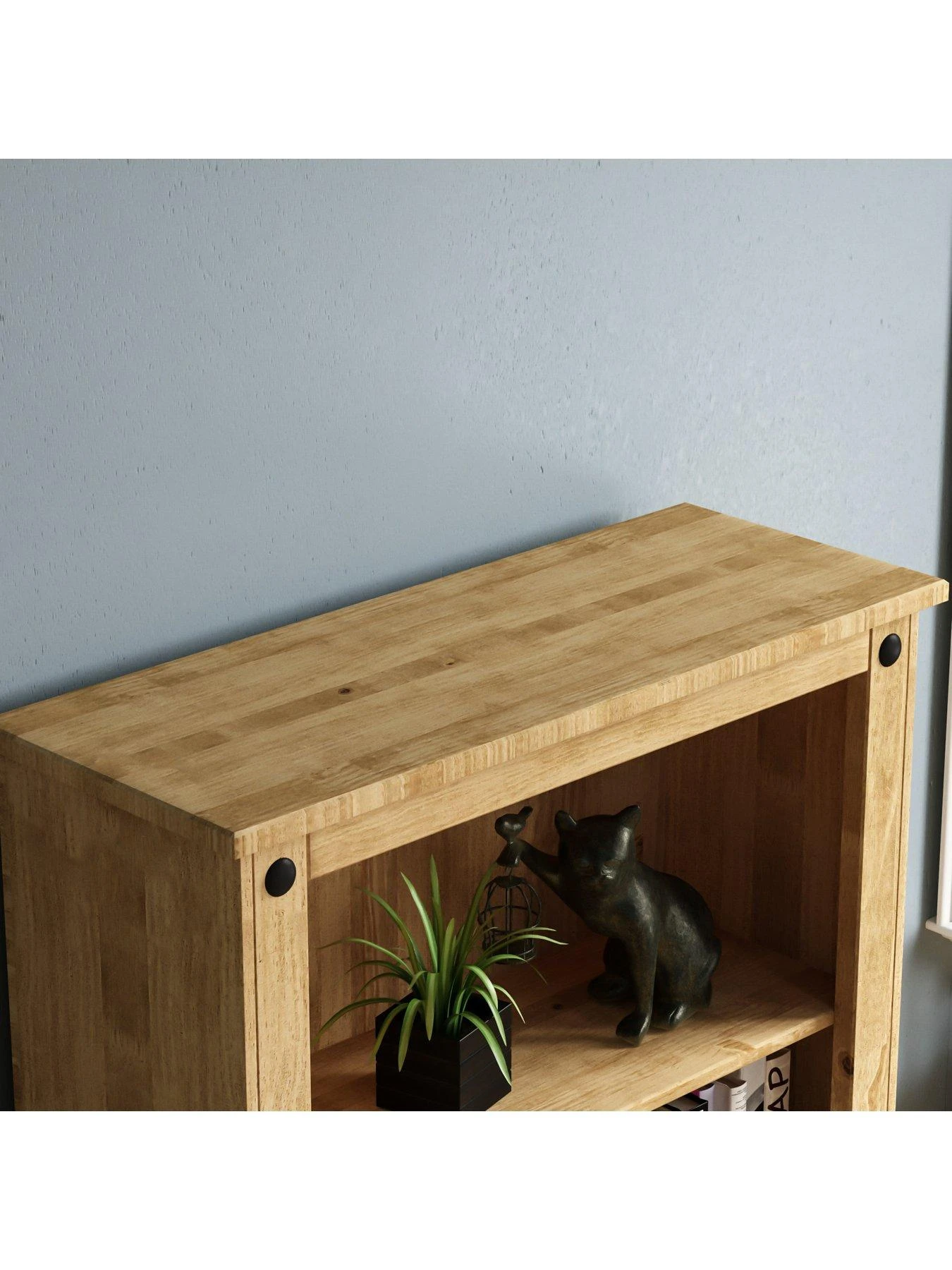 A waxed finish draws out the grain detail and helps protect the wood, while added rustic charm comes from the black metal studwork and a curved plinth. 3 shelves provide lots of room for all your paperbacks, cook books, ornaments and more, while a 2 door cupboard is a handy hideaway for clutter.