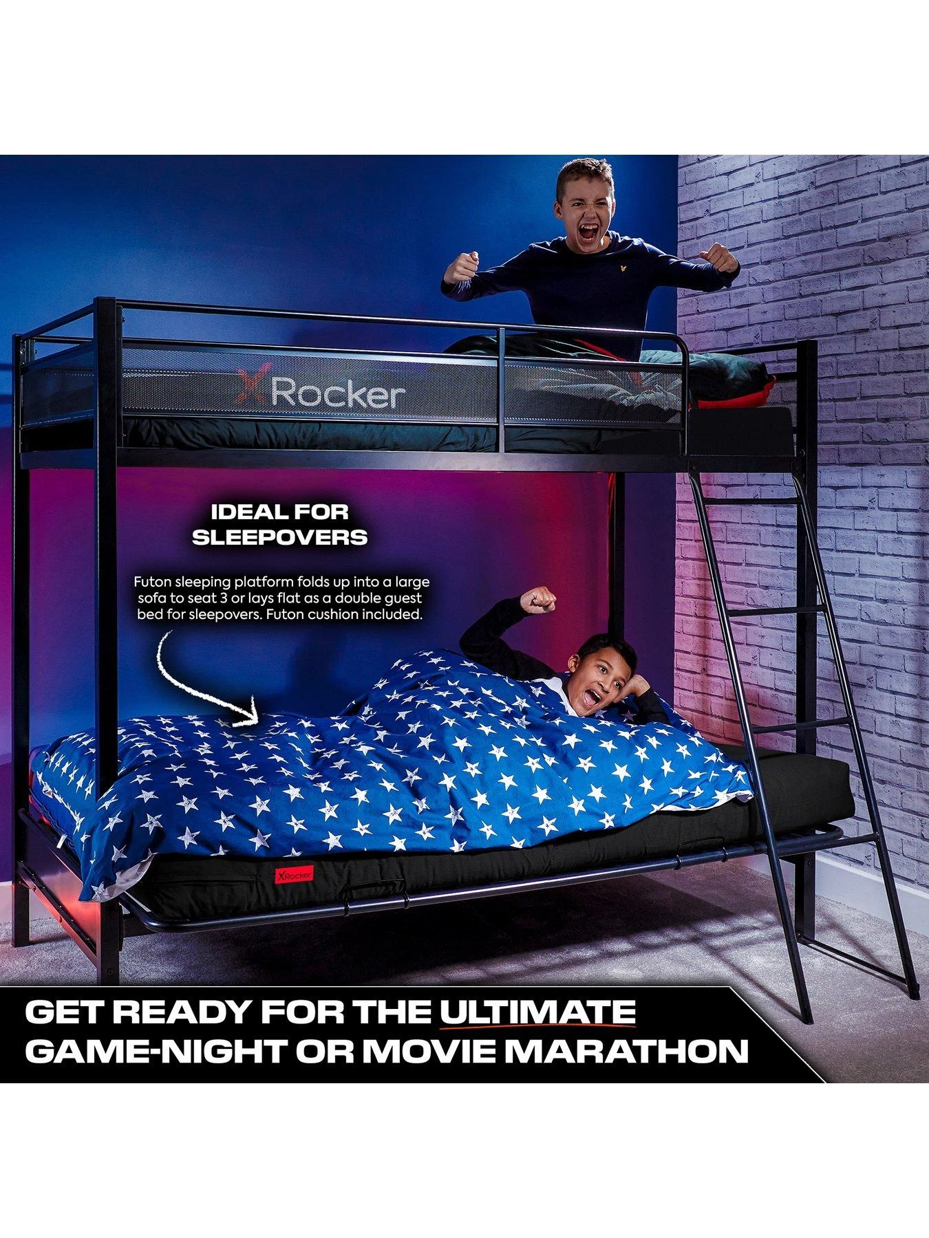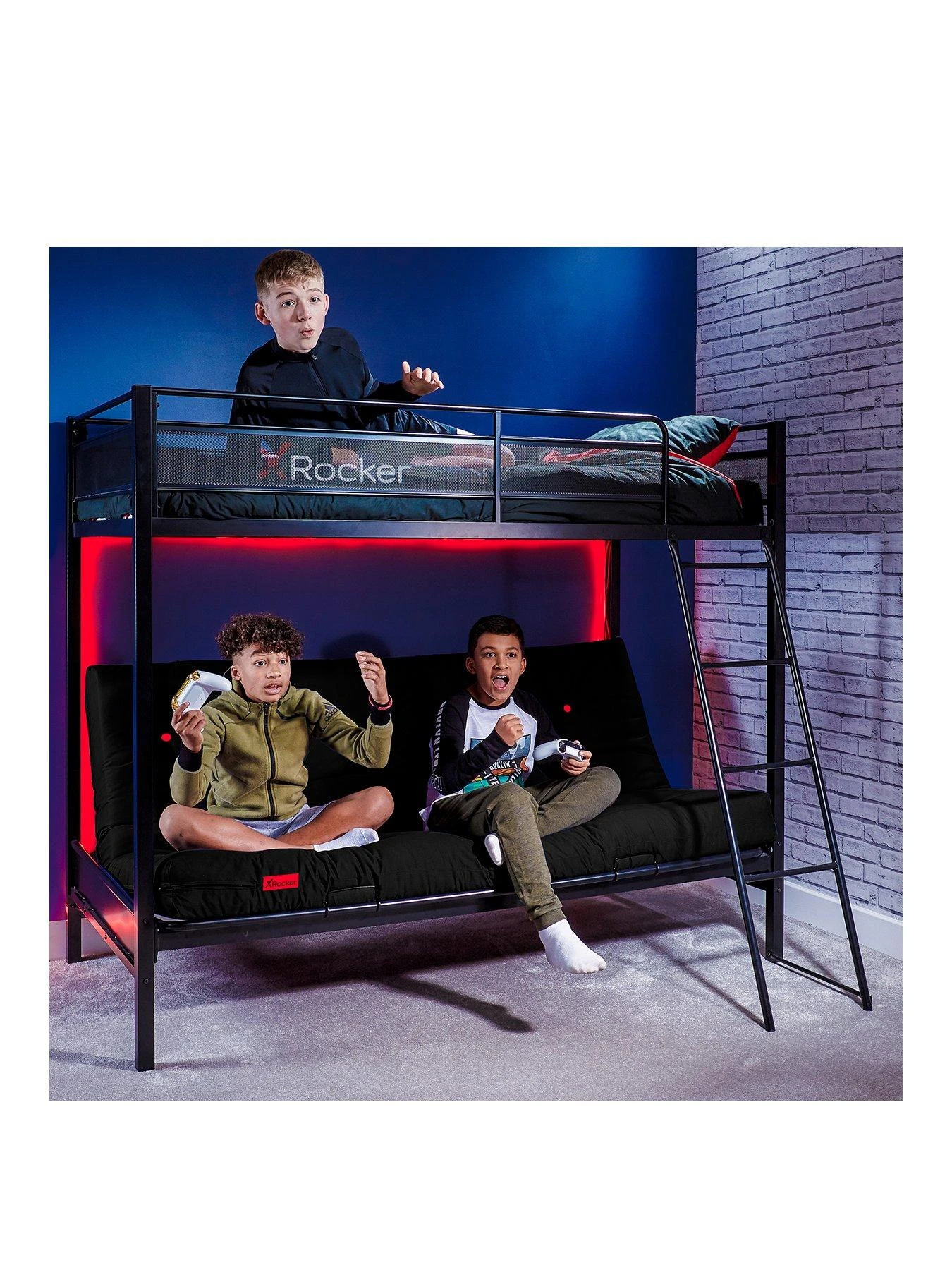 It comes in a smart black shade and the top bunk is detailed with metal mesh and X Rocker branding, while the futon cushion features red button detailing. Please note: single size mattress for top bunk must be purchased separately.